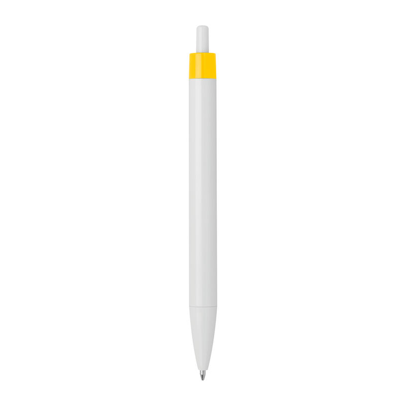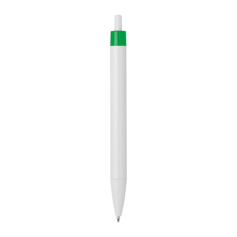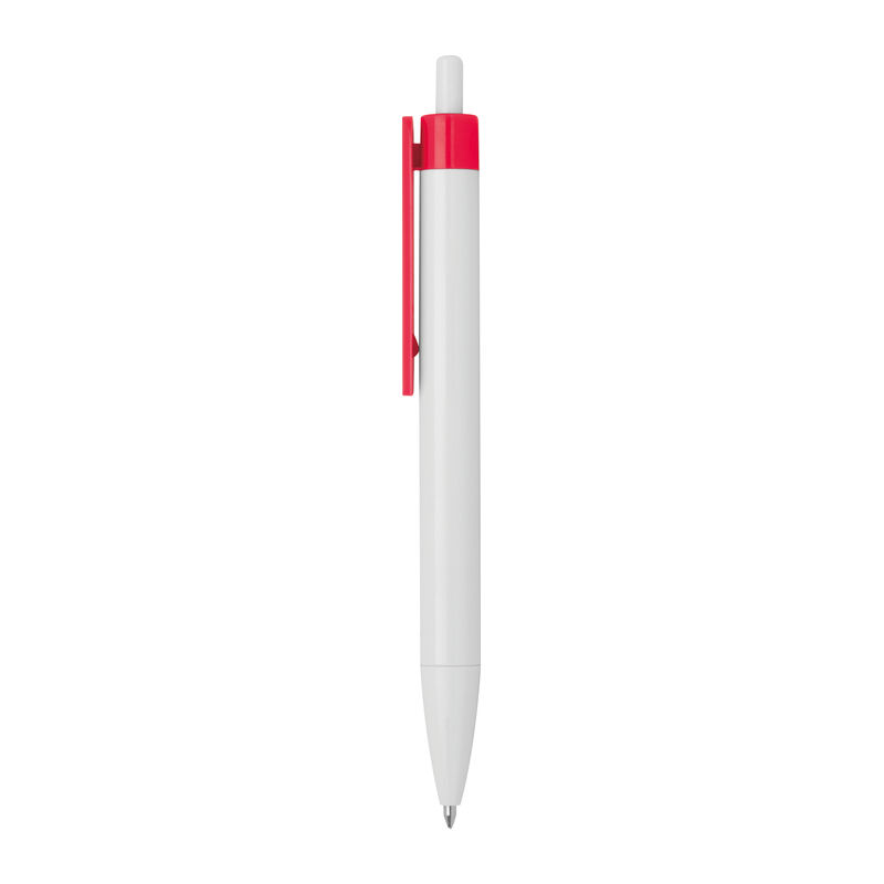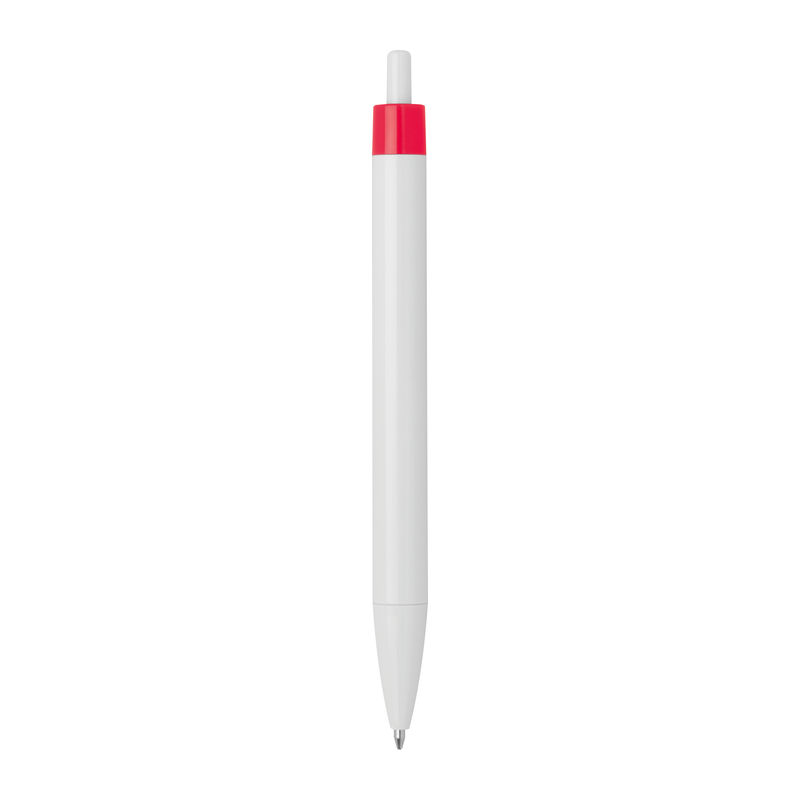 Λευκό πλαστικό στυλό με μπίλια, εφοδιασμένο με έγχρωμο κλιπ και ανταλλακτικό με μπλε μελάνι.