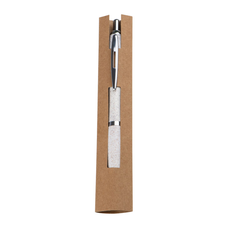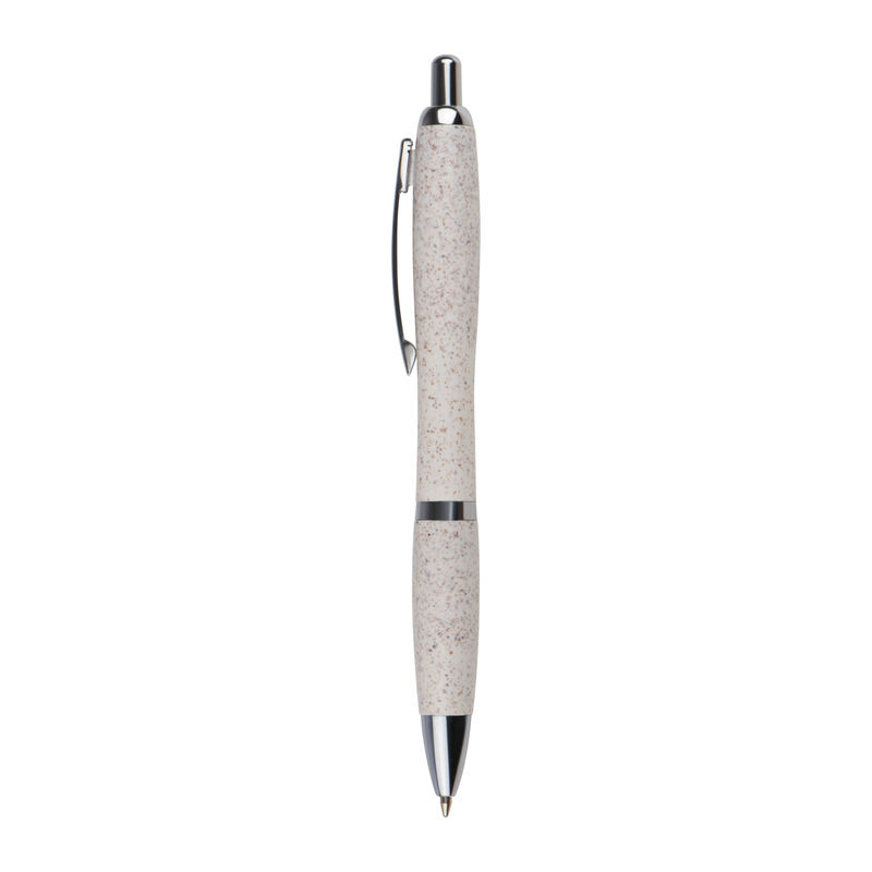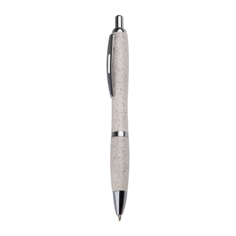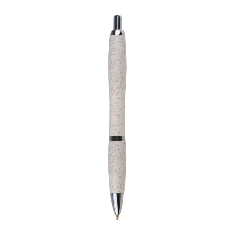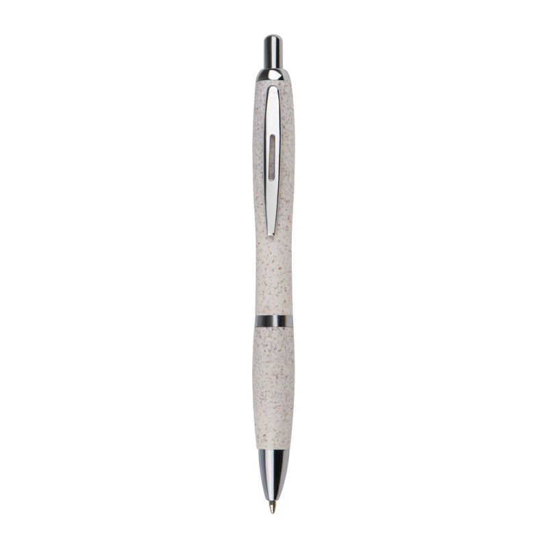 Κλασικό πλαστικό στυλό με επίστρωση από άχυρο σταριού, ασημένιες λεπτομέρειες και ανταλλακτικό με μελάνι μπλε χρώματος.