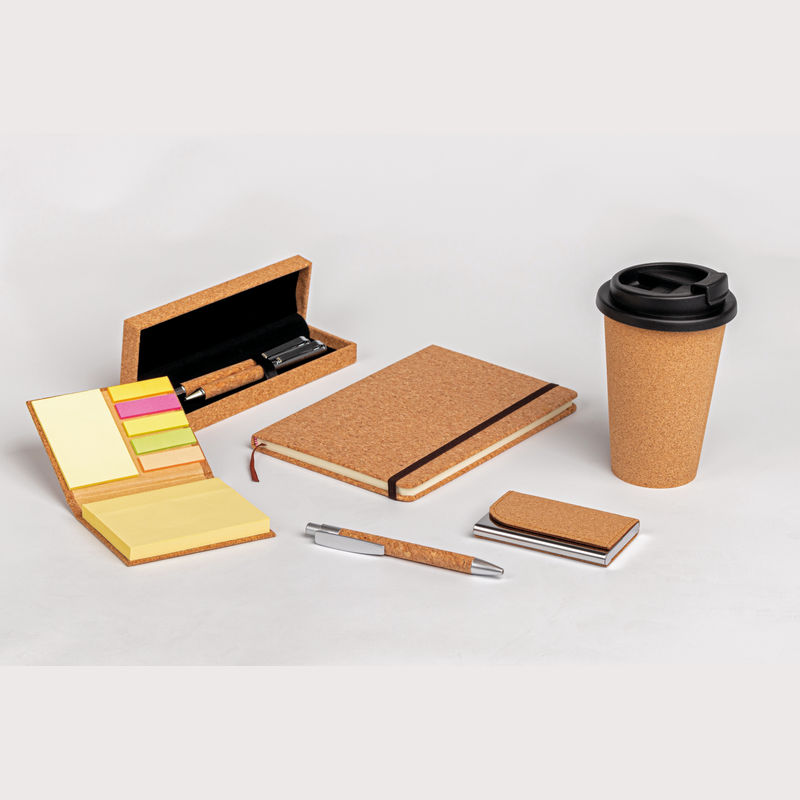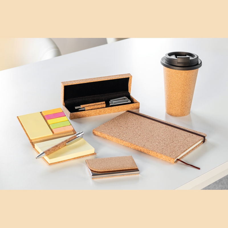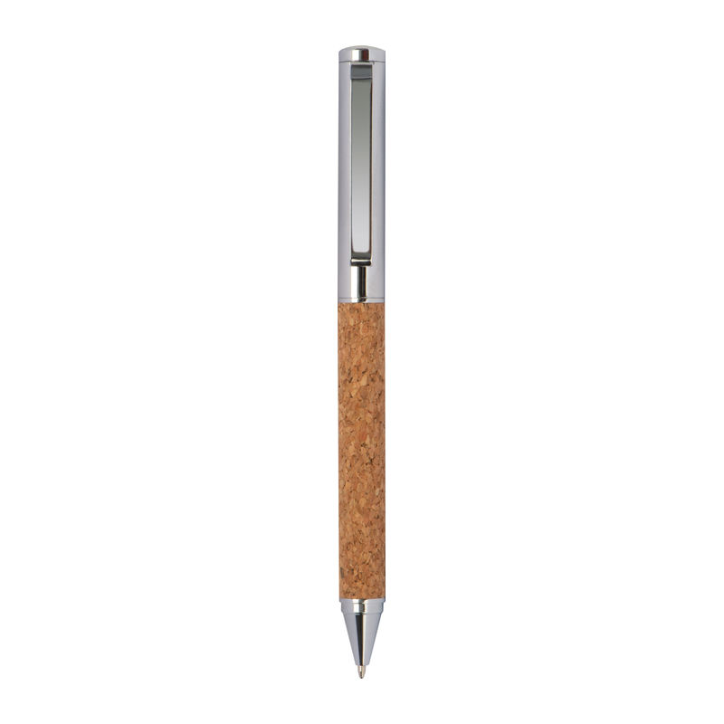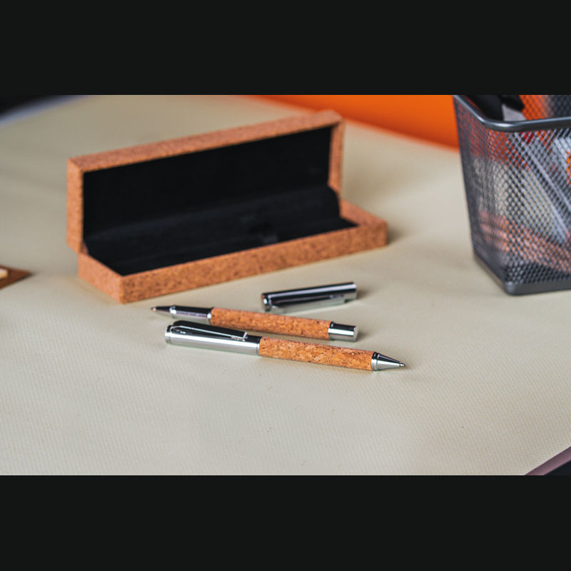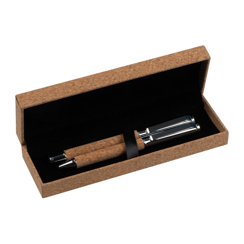 Μεταλλικό σετ γραφής με επίστρωση φελλού, που περιλαμβάνει στυλό με μηχανισμό περιστροφής και μεγάλη χωρητικότητα ανταλλακτικού, καθώς και rollerball.