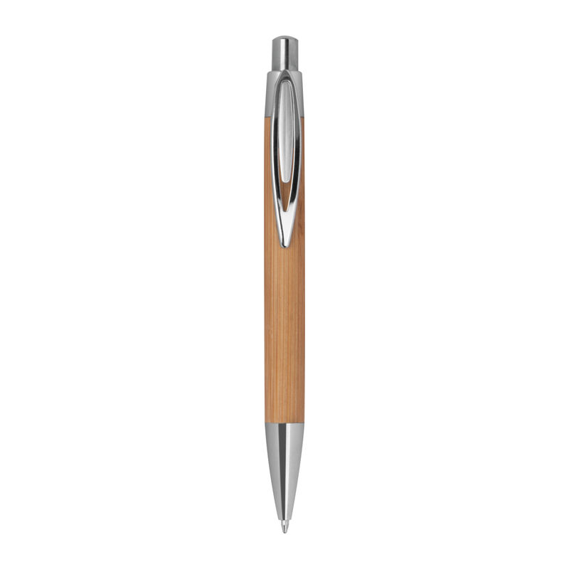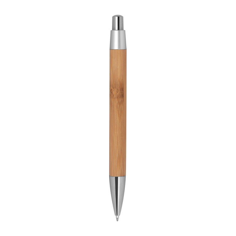 Πλαστικό στυλό με επίστρωση από μπαμπού, ασημένιες λεπτομέρειες, ανταλλακτικό με μελάνι μπλε χρώματος και εντυπωσιακό κλιπ.