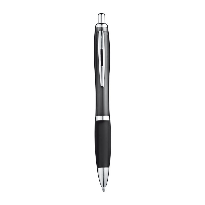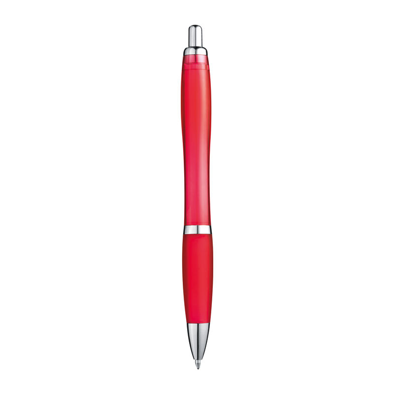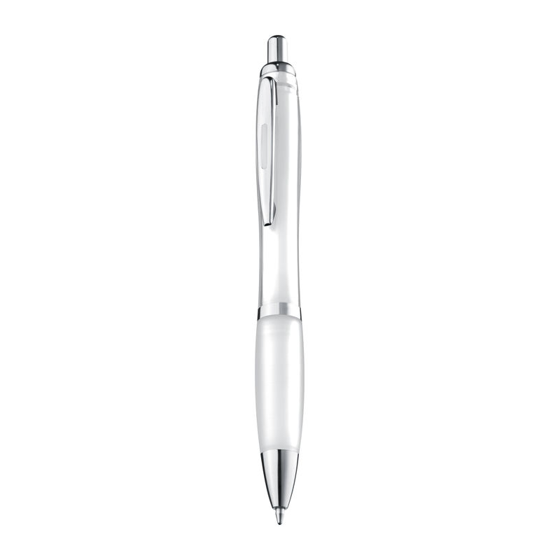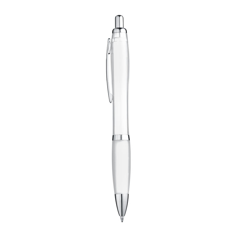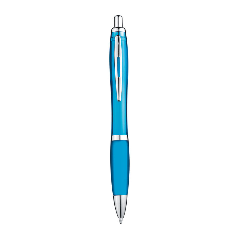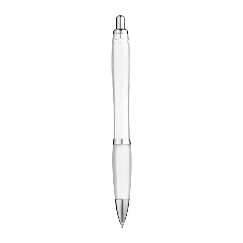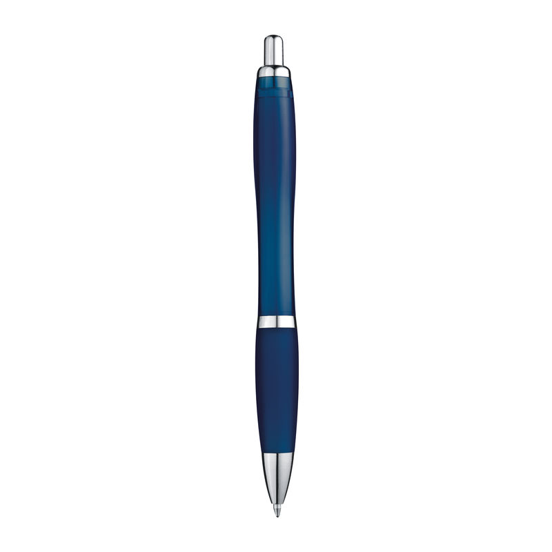 Διάφανο στυλό με μπίλια, ασημένιο μεταλλικό κλιπ, ελαστική ζώνη λαβής και μεγάλη ανταλλακτική φιάλη με μπλε μελάνι. Εκτυπώνουμε το λογότυπό σας δεξιά από το κλιπ.