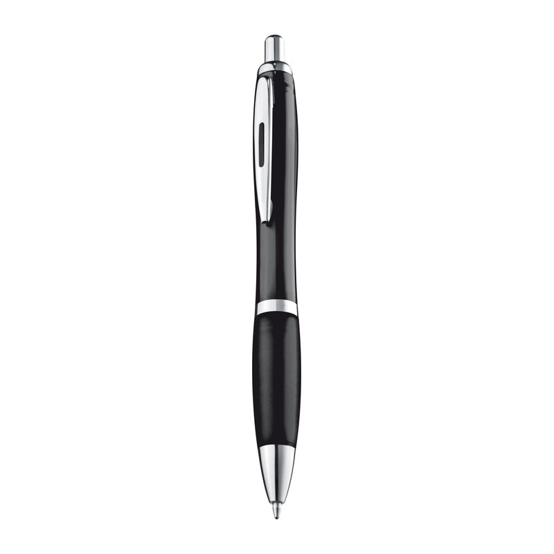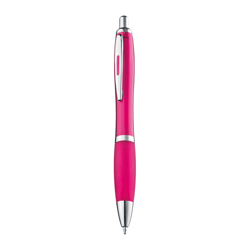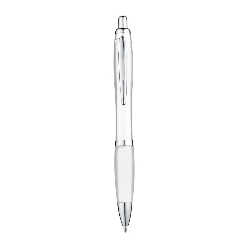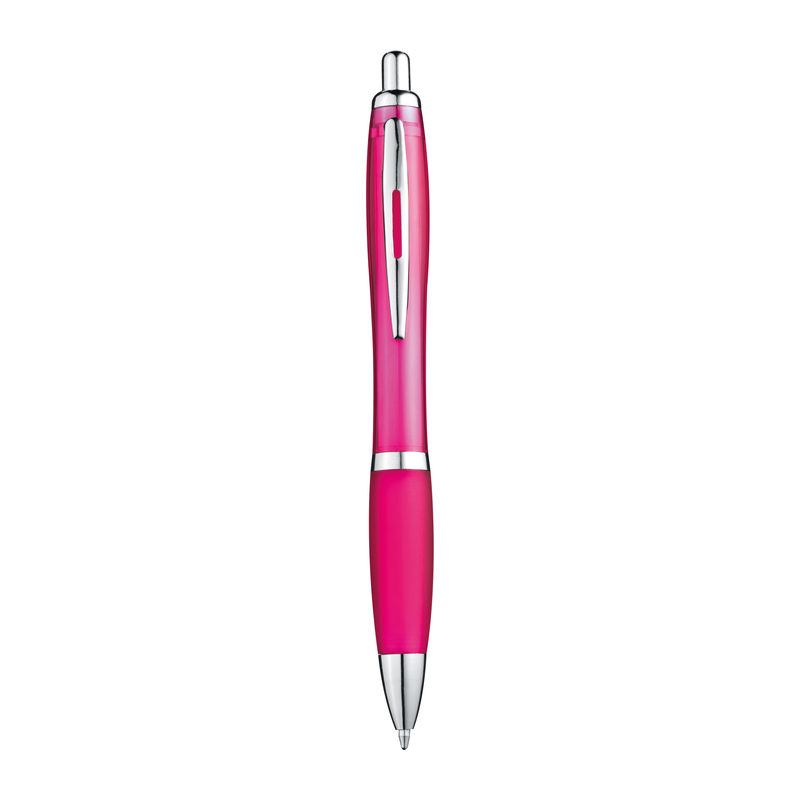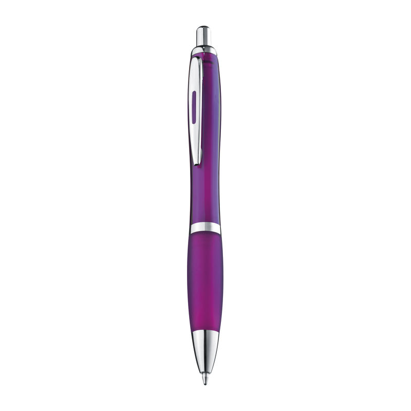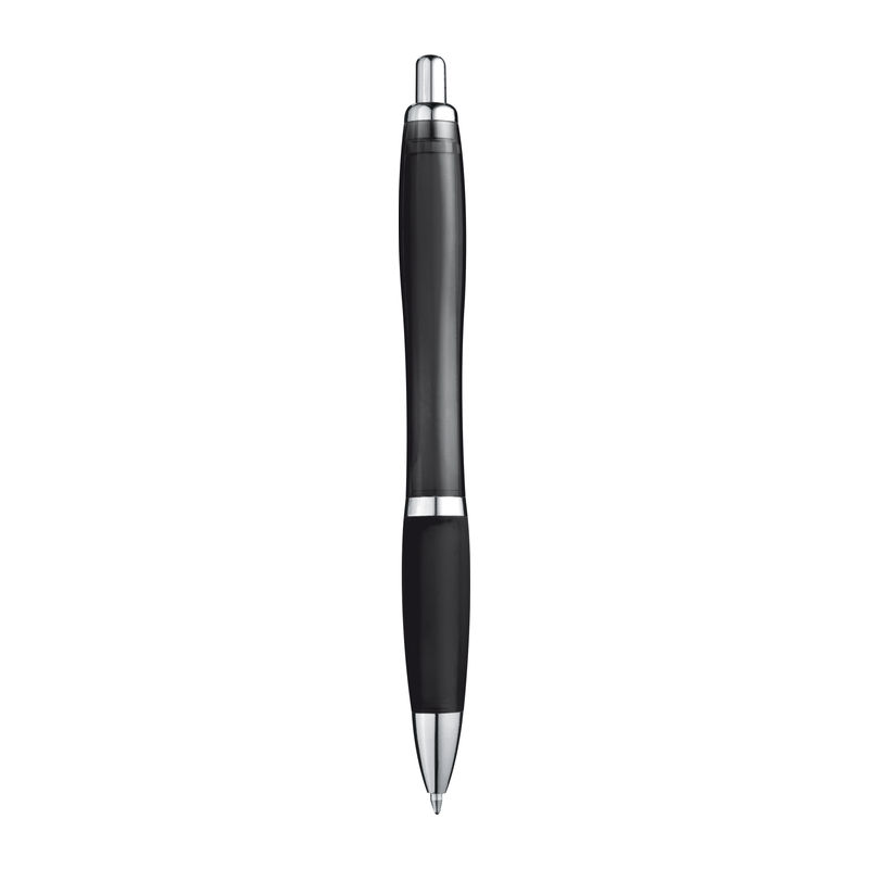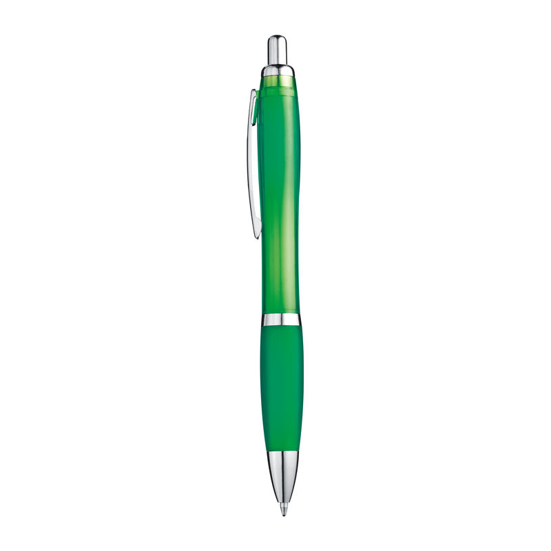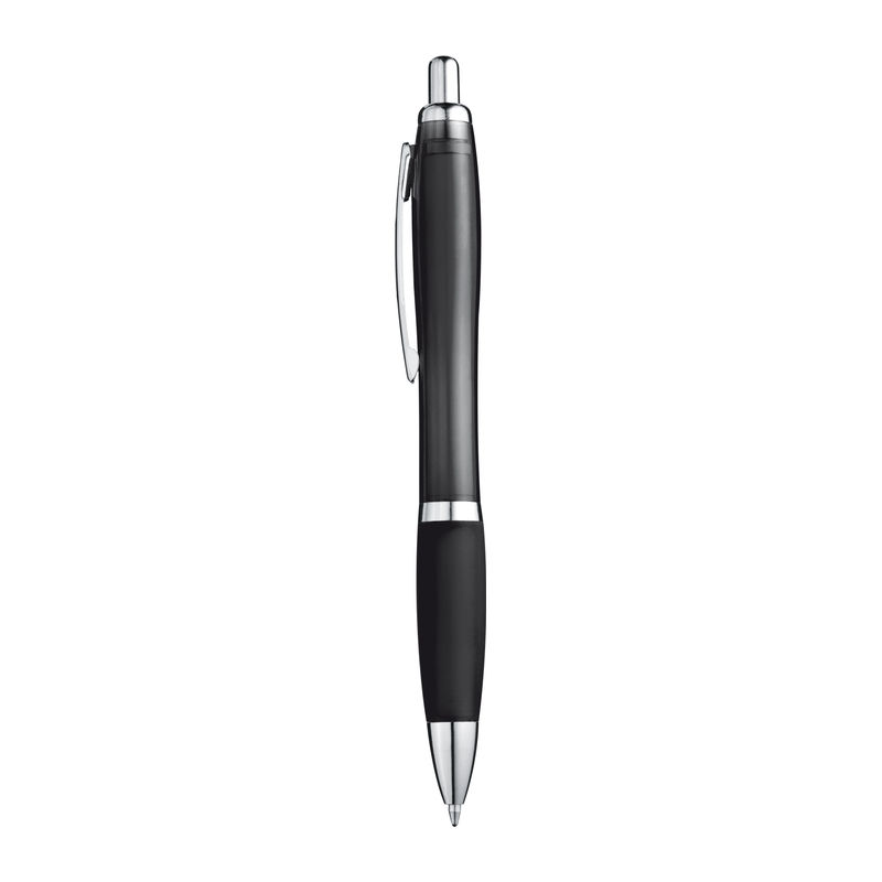 Διάφανο στυλό με μπίλια, ασημένιο μεταλλικό κλιπ, ελαστική ζώνη λαβής και μεγάλη ανταλλακτική φιάλη με μπλε μελάνι. Εκτυπώνουμε το λογότυπό σας δεξιά από το κλιπ.