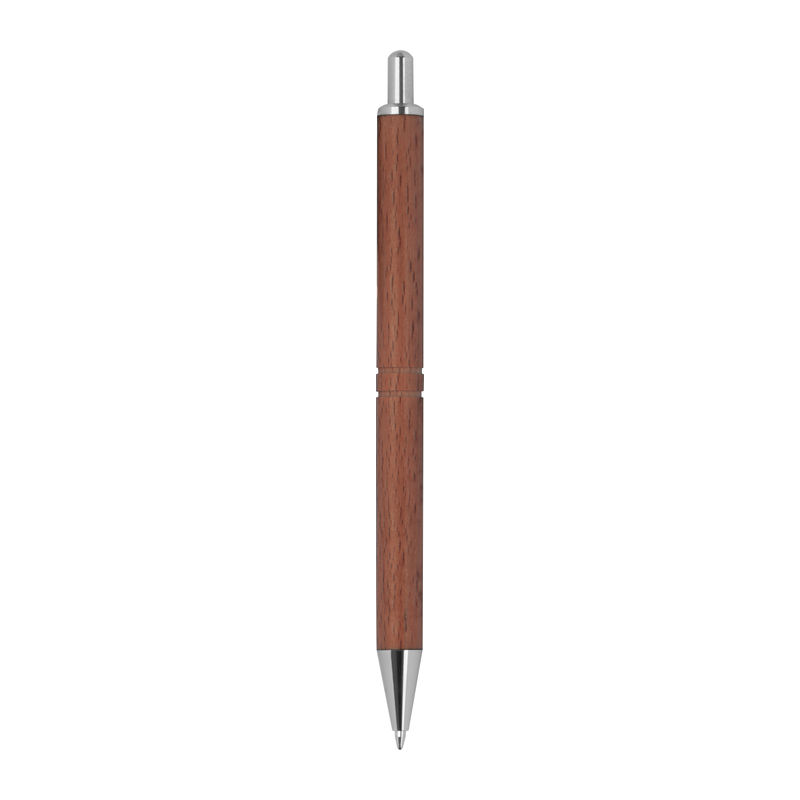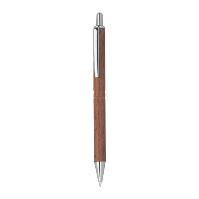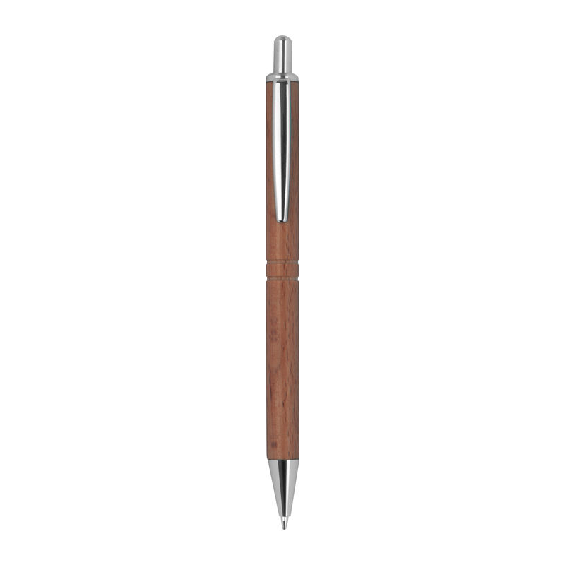 Ξύλινο στυλό με μπίλια, με μπλε ανταλλακτικό μελάνι, ασημένιες λεπτομέρειες και δύο εγκοπές γύρω από το σώμα.