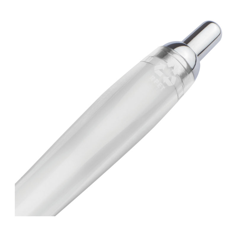 Κλασικό στυλό με μπίλια κατασκευασμένο από RPET, διαφανές με ασημένιες λεπτομέρειες, ελαστικό περίβλημα και ανταλλακτικό με μεγάλο ανταλλακτικό μελάνης μπλε χρώματος.