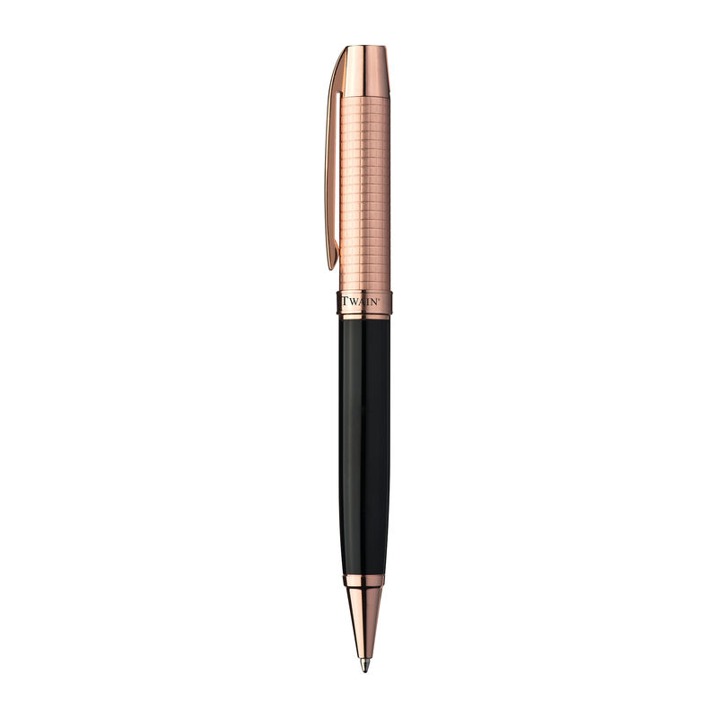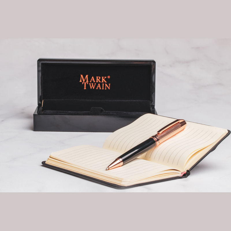 Υψηλής ποιότητας στυλό μπίλιας Mark Twain από χαλκό, με μηχανισμό περιστροφής και μεγάλο ανταλλακτικό με μπλε μελάνι που ξεχωρίζει.