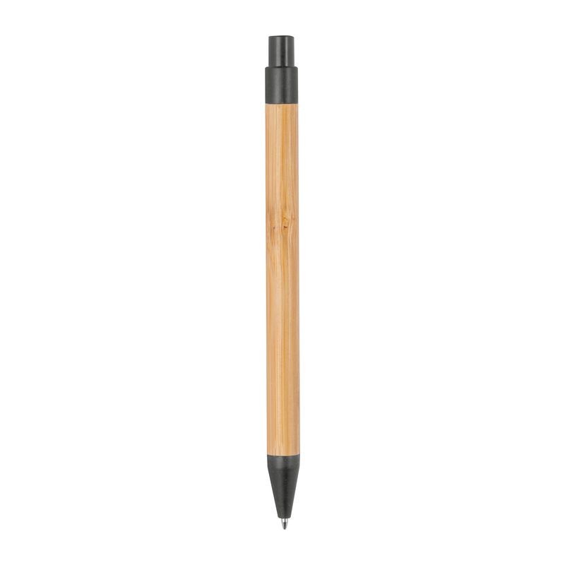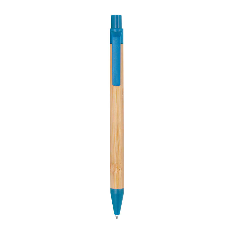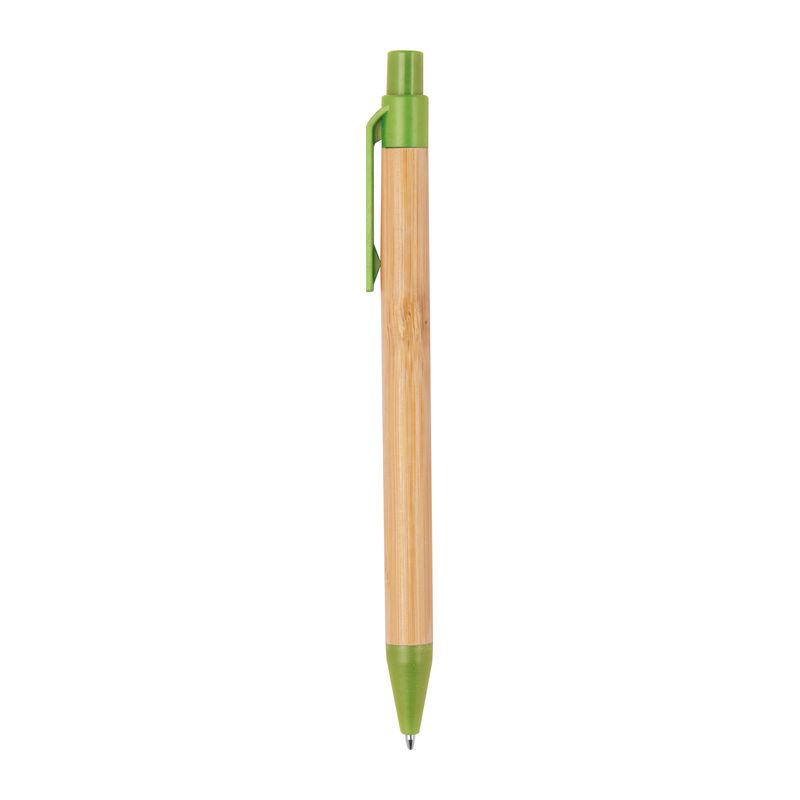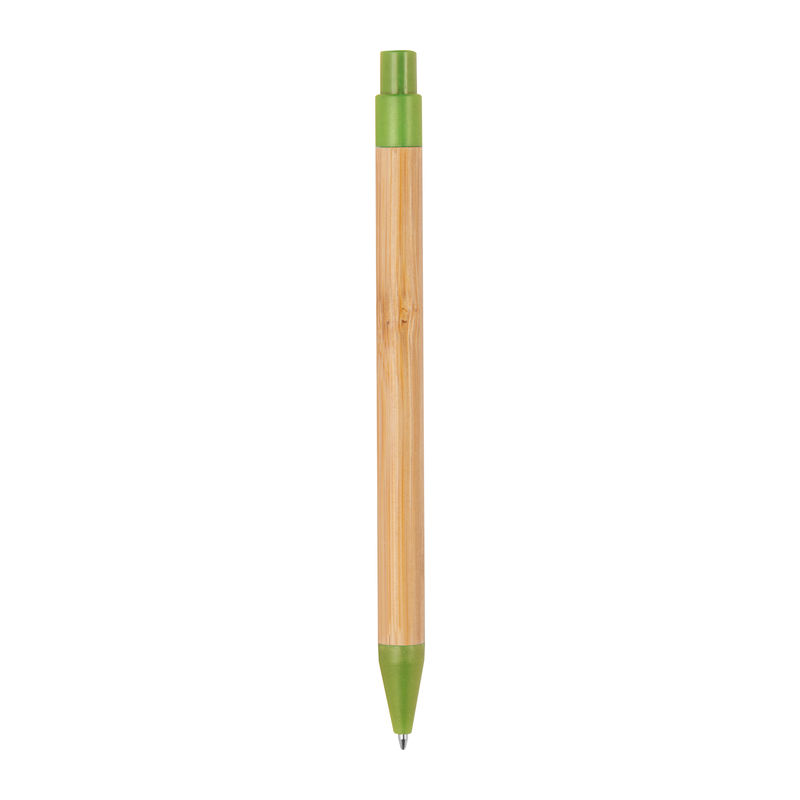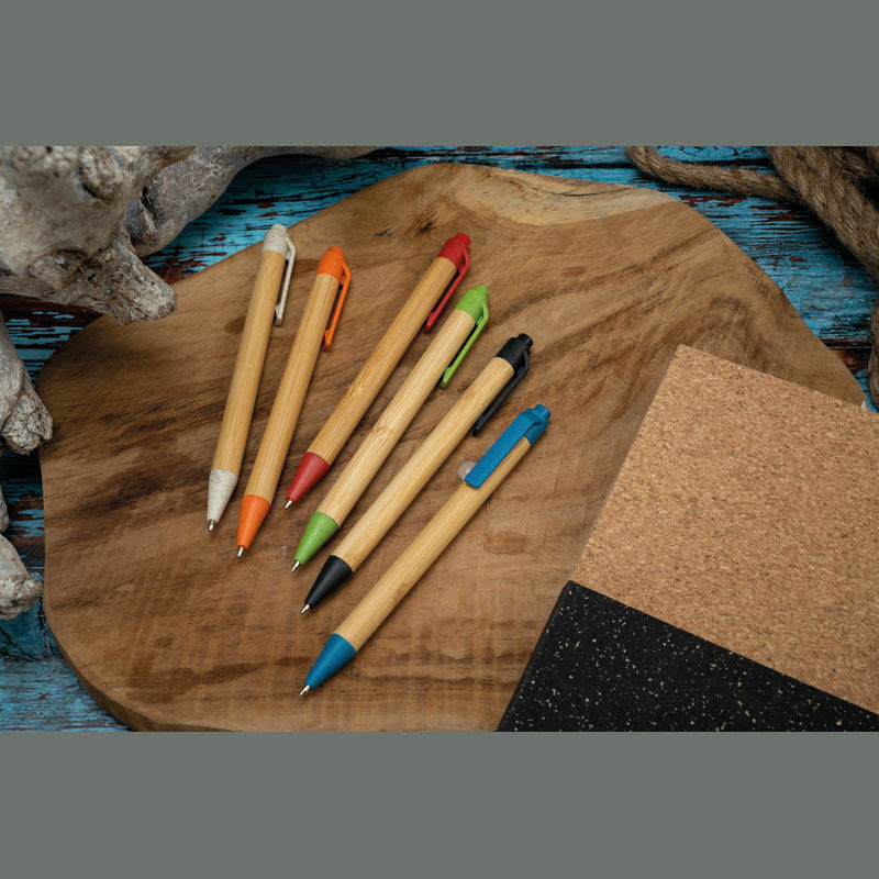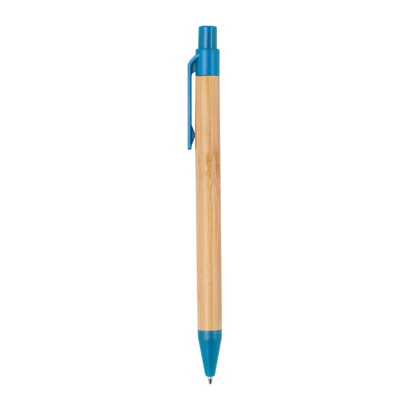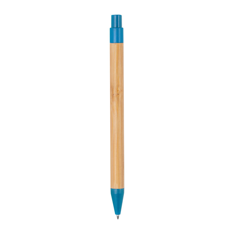 Αναδιπλούμενο στυλό από μπαμπού, διακοσμημένο με πολύχρωμες εφαρμογές από άχυρο σίτου και με ανταλλακτικό με μελάνι μπλε χρώματος.
