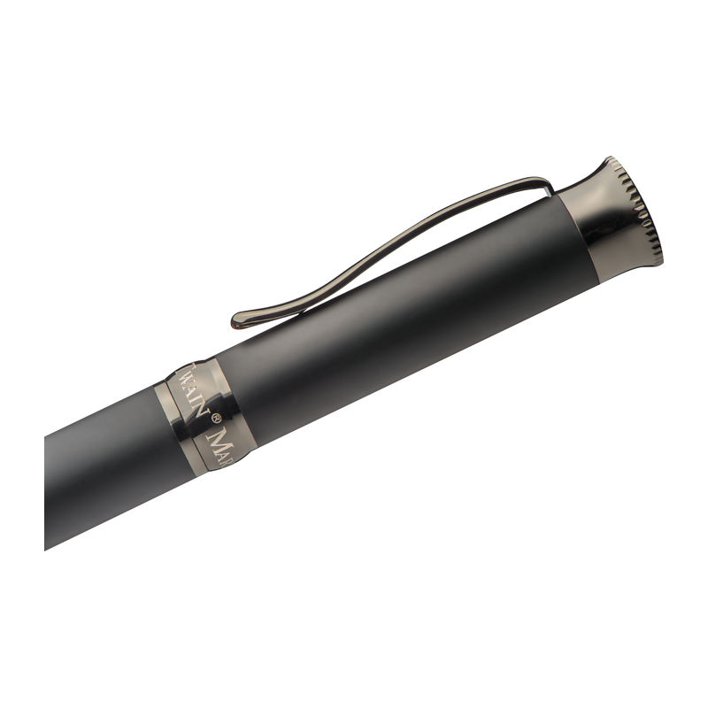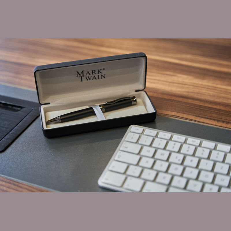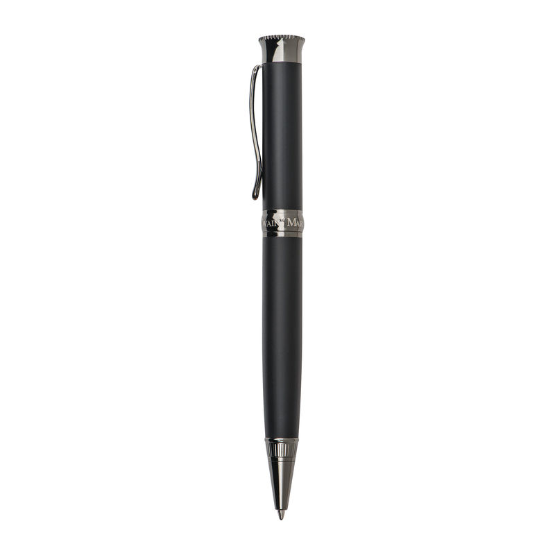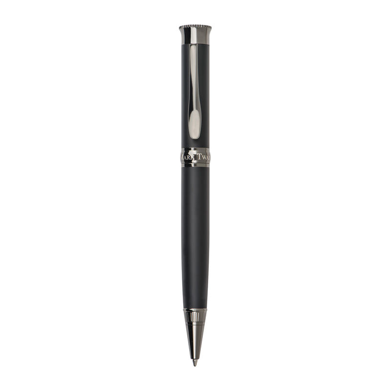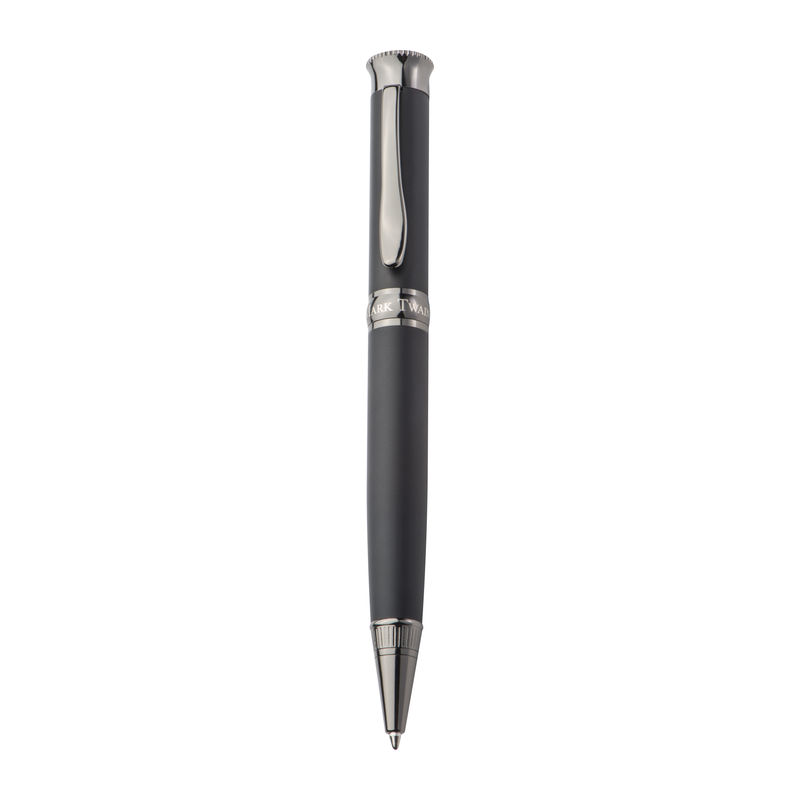 Σετ γραφής Mark Twain από μέταλλο, τριών τεμαχίων, που περιλαμβάνει μία πένα με αναπληρώσιμη μελανοθήκη, ένα μεταλλικό στυλό με μεγάλο ανταλλακτικό μαύρης μελάνης, καθώς και ένα rollerball με μπλε μελάνι.