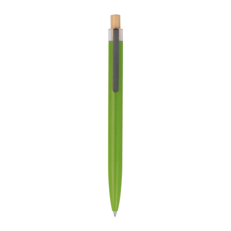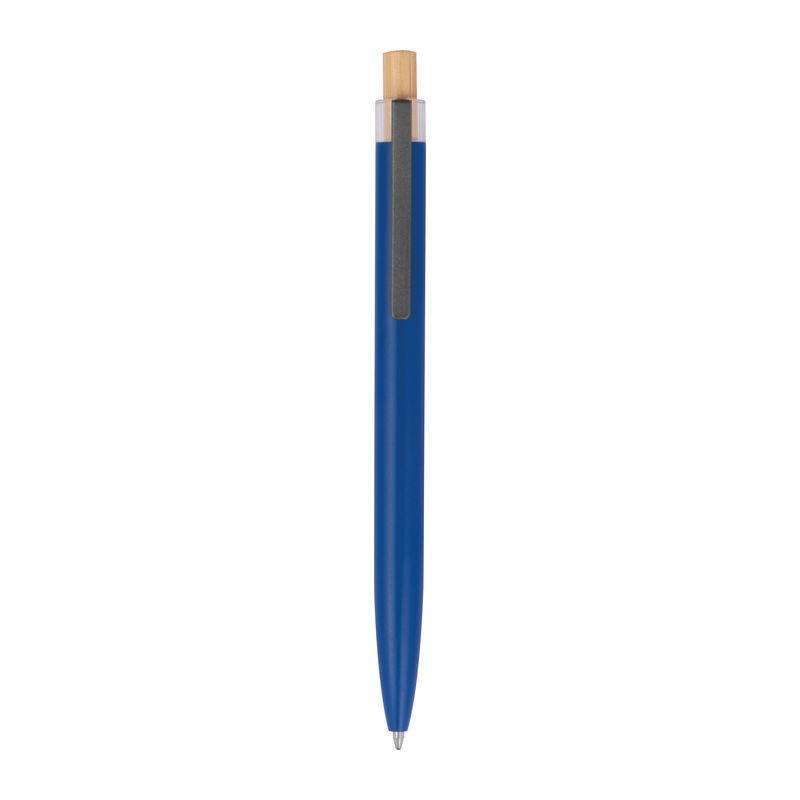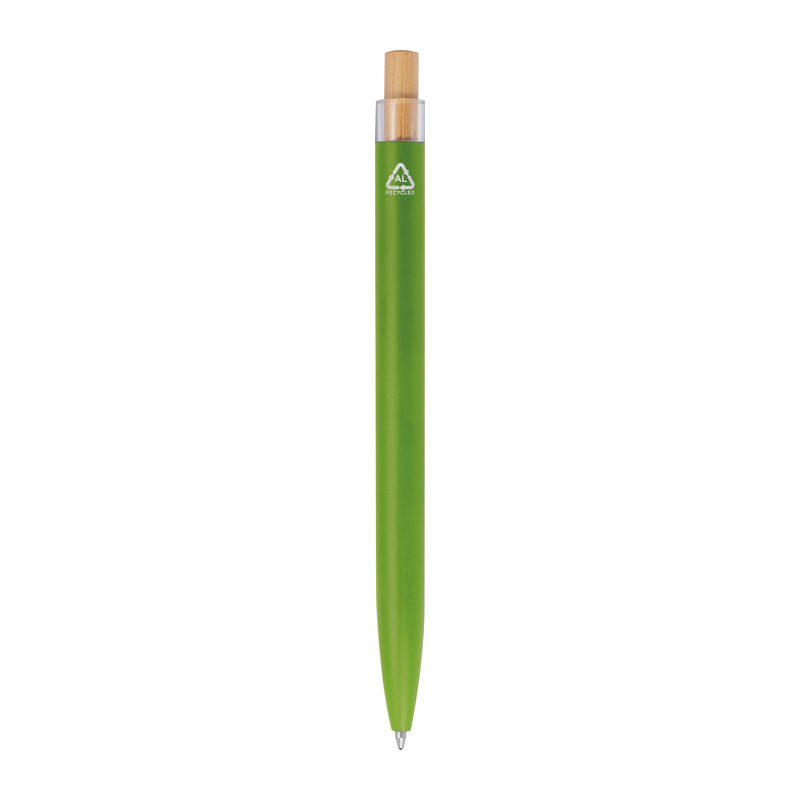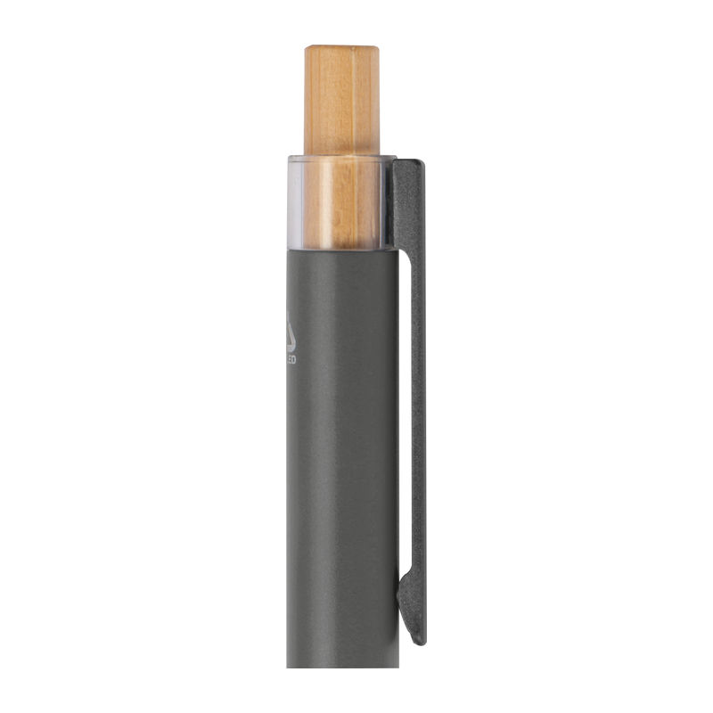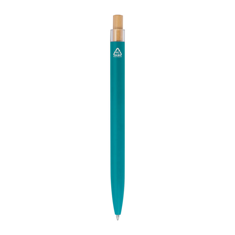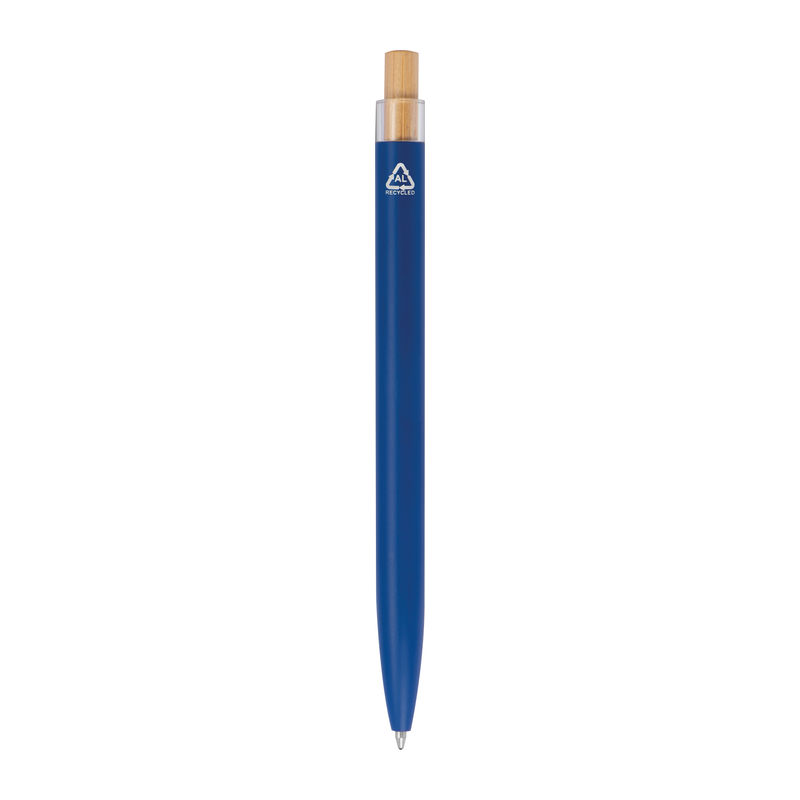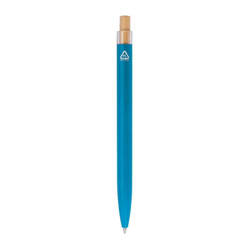 Στυλό με μπίλια κατασκευασμένο από ανακυκλωμένο αλουμίνιο, με μεταλλικό κλιπ, μπλε ανταλλακτικό και μηχανισμό πίεσης από μπαμπού.