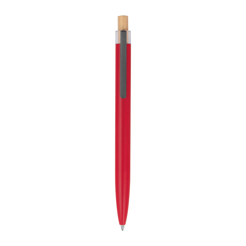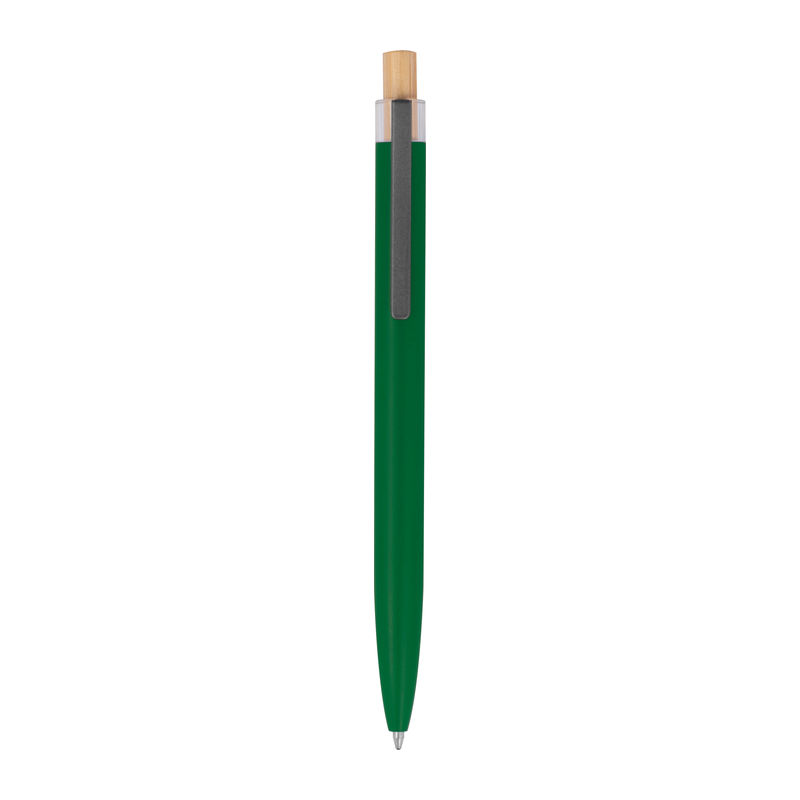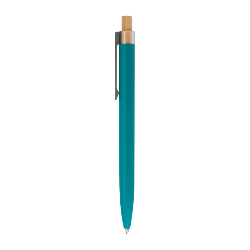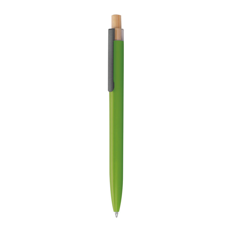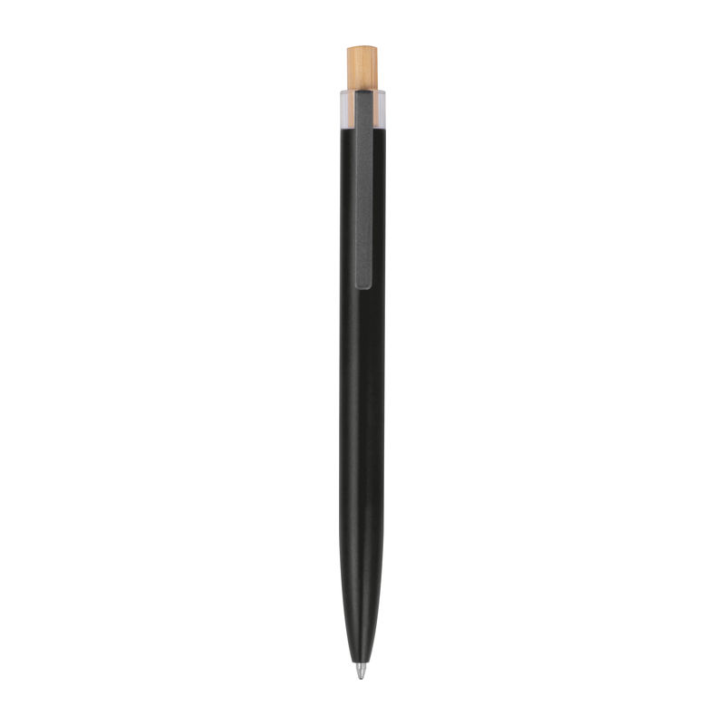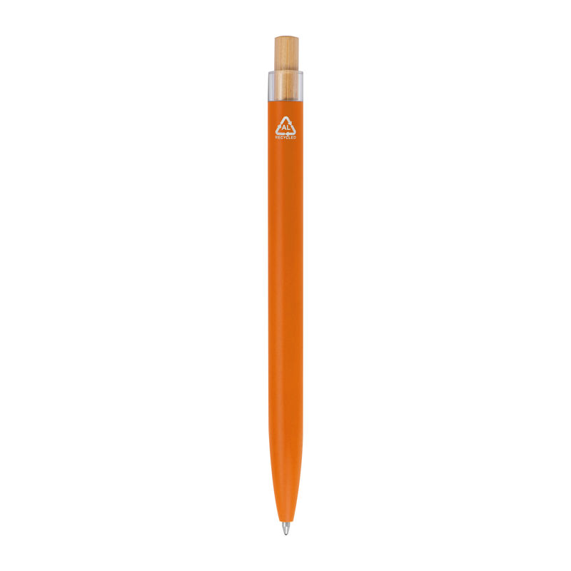 Στυλό με μπίλια κατασκευασμένο από ανακυκλωμένο αλουμίνιο, με μεταλλικό κλιπ, μπλε ανταλλακτικό και μηχανισμό πίεσης από μπαμπού.