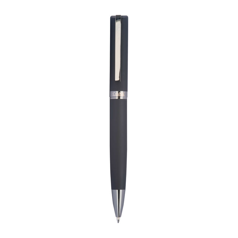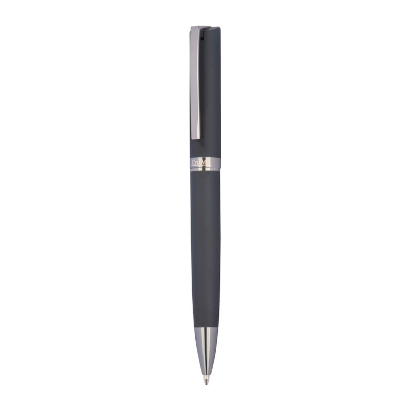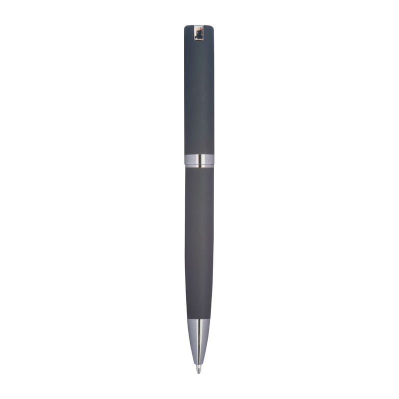 Στυλό με περιστρεφόμενο μηχανισμό, κατασκευασμένο από μέταλλο με ελαστική επιφάνεια, σε κλασικό σχεδιασμό.