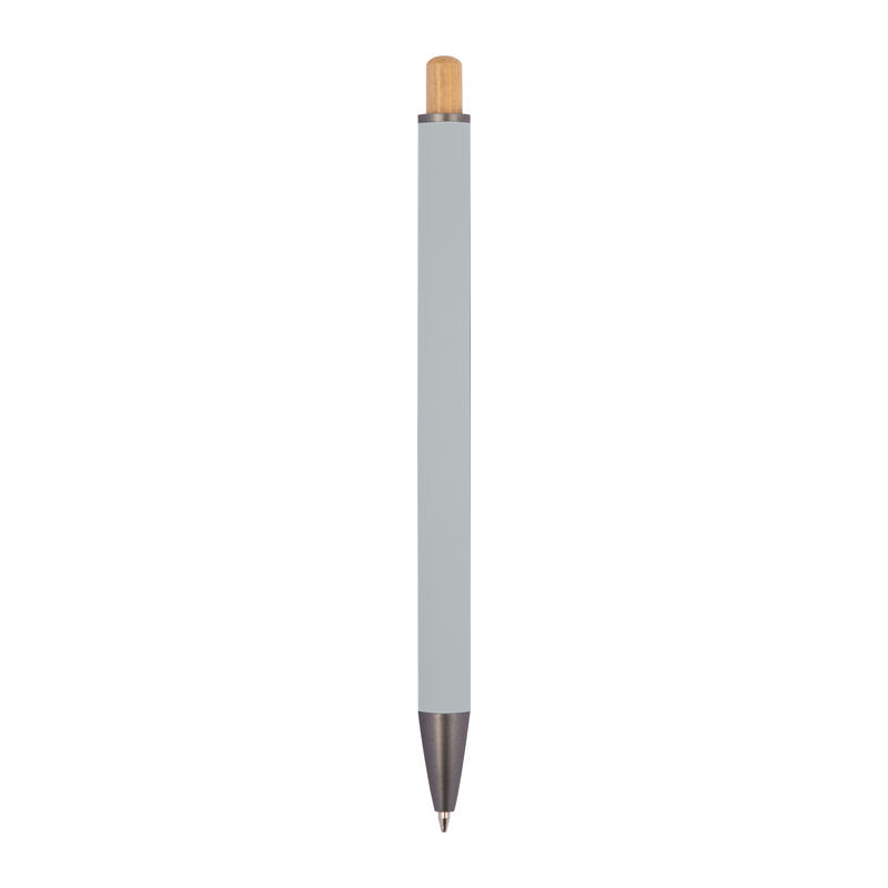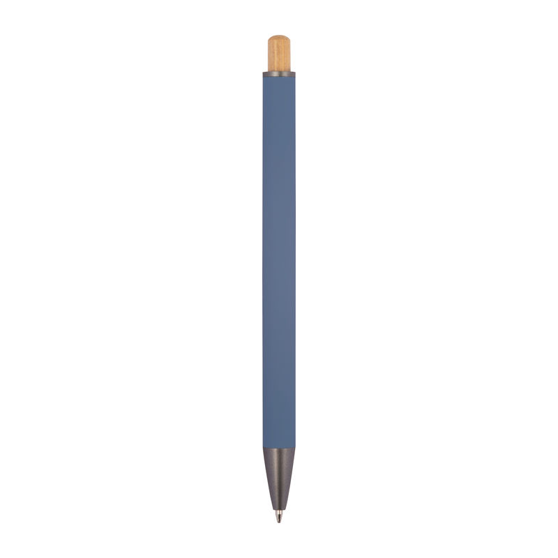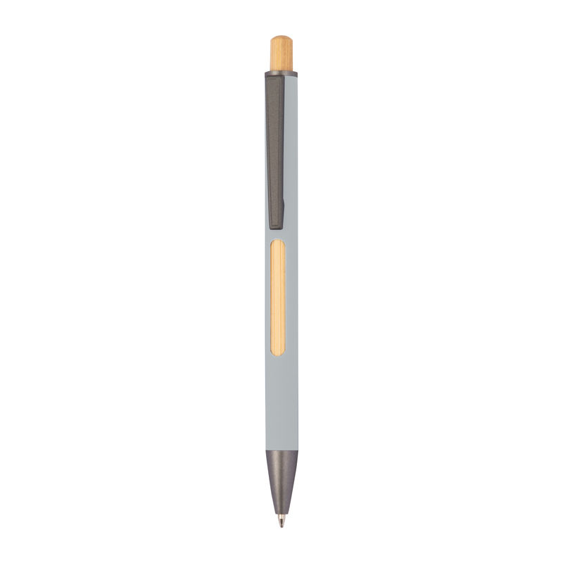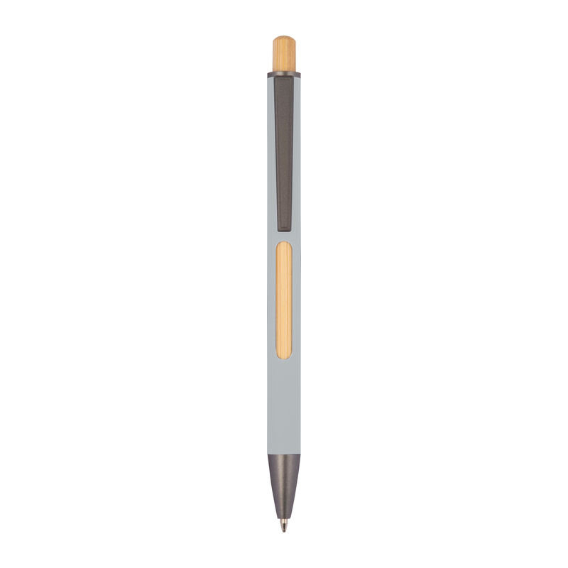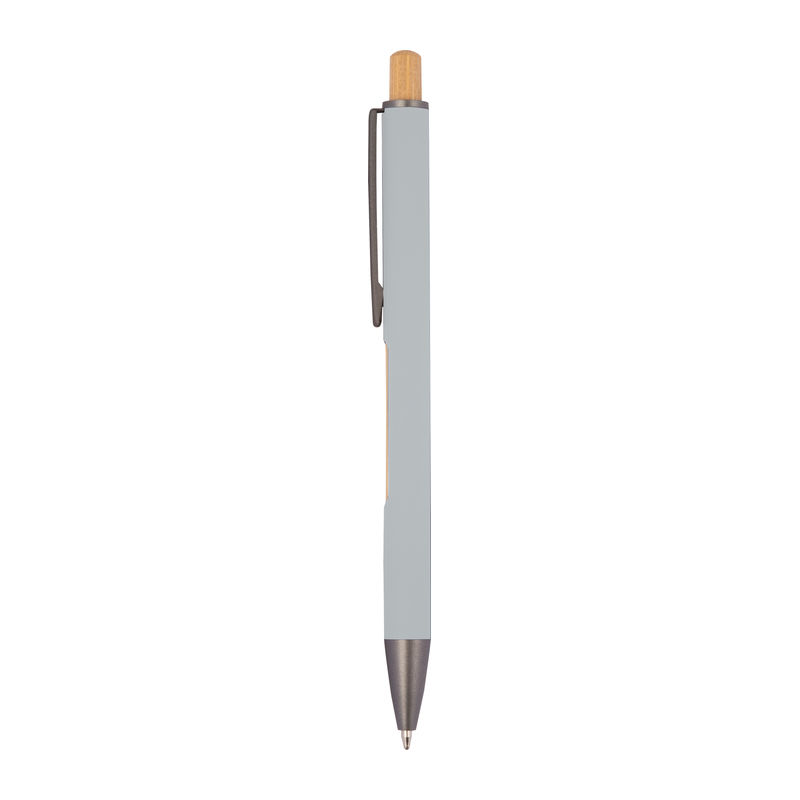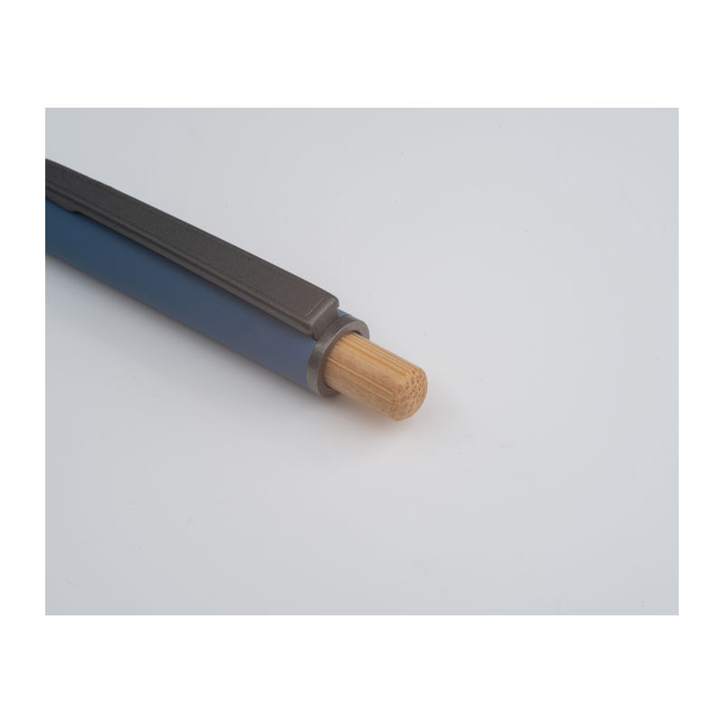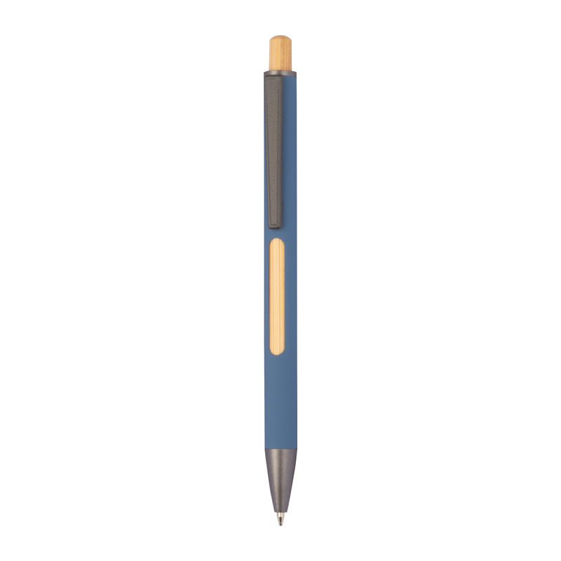 Στυλό από ανακυκλωμένο αλουμίνιο με μαύρο μεταλλικό κλιπ, μπλε ανταλλακτικό, μπουτον από μπαμπού και παράθυρο από μπαμπού στο ύψος του κλιπ.