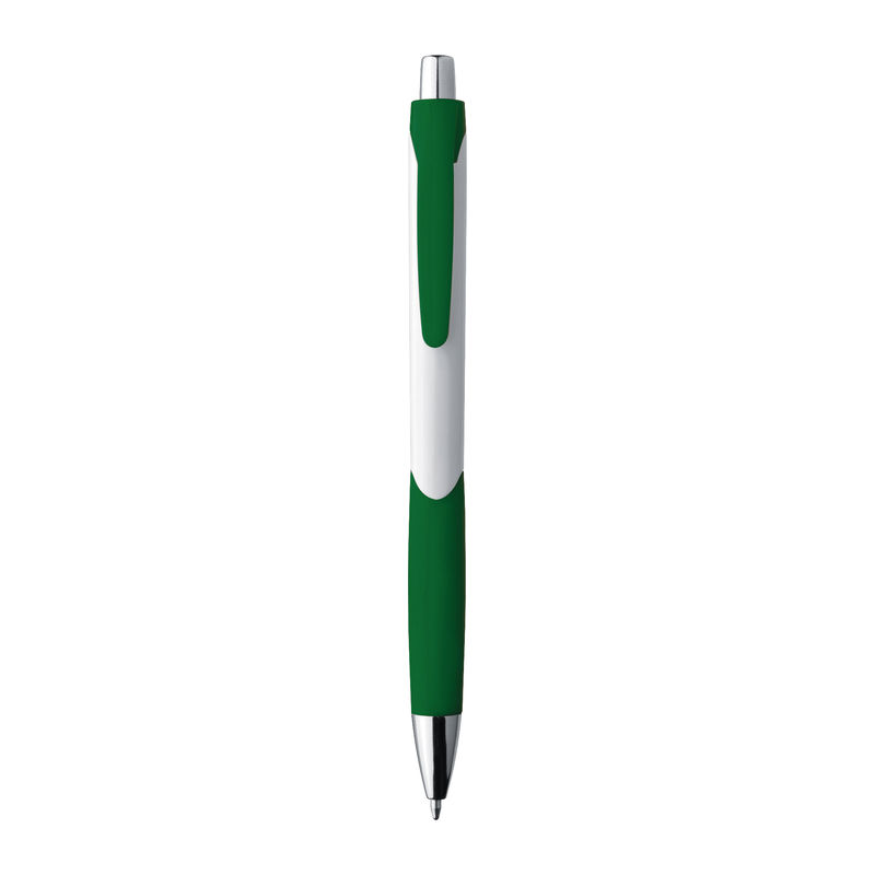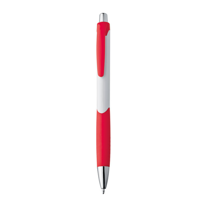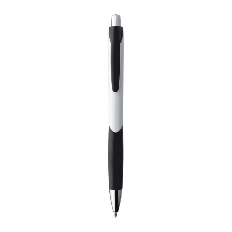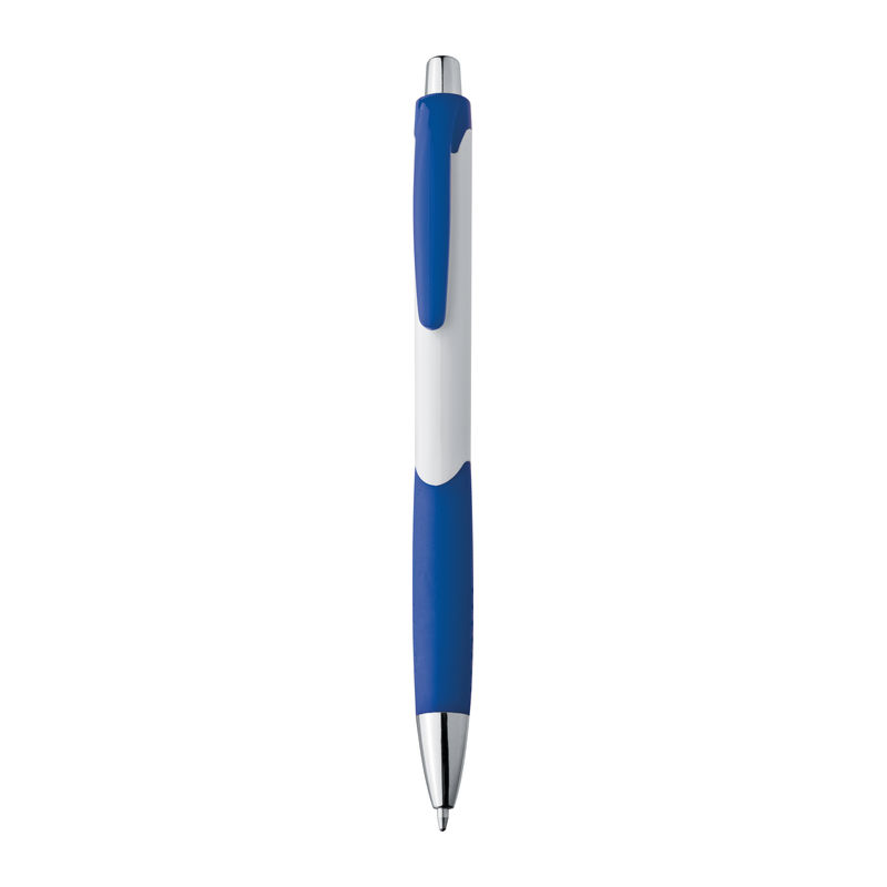 Στυλό με μπίλια και μηχανισμό μπουτόν, ελαστική ζώνη λαβής, ανταλλακτικό με μπλε μελάνι, μεταλλικό κουμπί και μύτη.