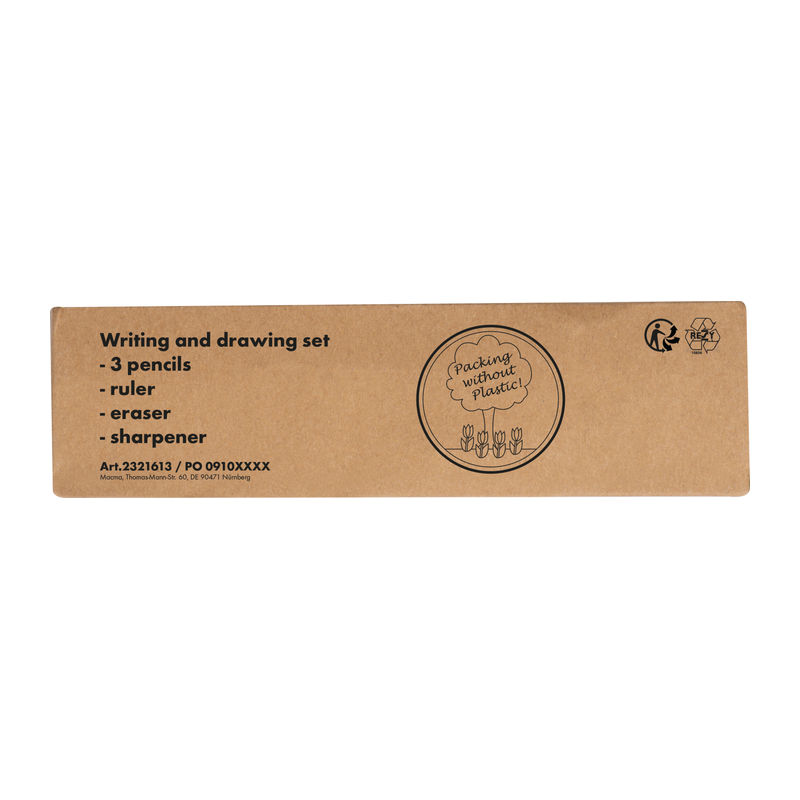 Σετ γραφής και σχεδίου που περιλαμβάνει 3 μολύβια με διαφορετικούς βαθμούς σκληρότητας, χάρακα, γόμα και ξύστρα.