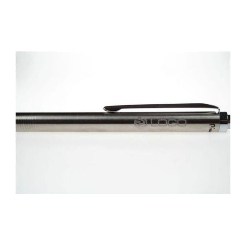 Πολυτελές στυλό διαρκείας Pierre Cardin με ασημένιο σώμα από αλουμίνιο και απλό κλιπ, με λεπτή χάραξη στην επιφάνεια. Περιλαμβάνει μπλε ανταλλακτικό με μέγιστο μέγεθος εκτύπωσης 50 × 5 mm.