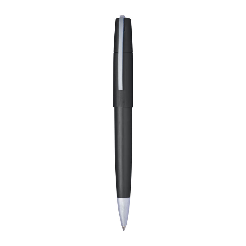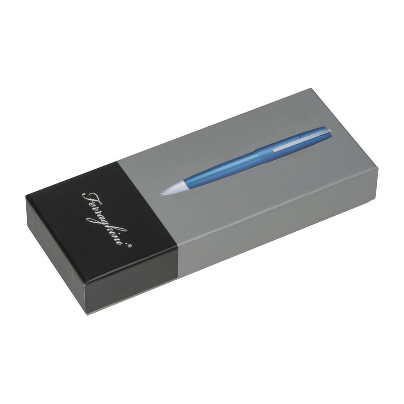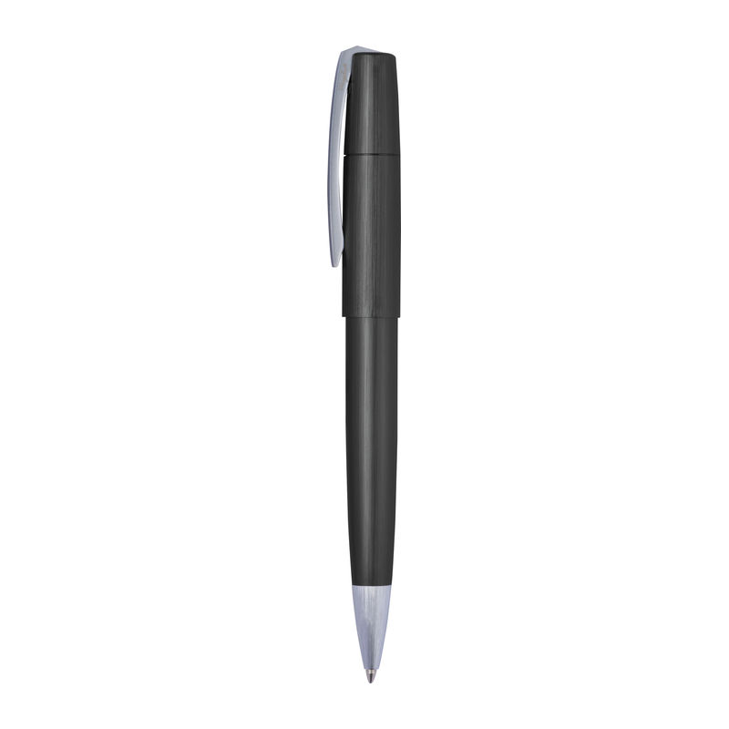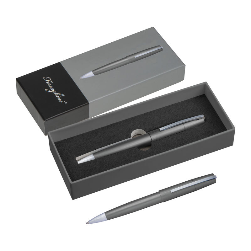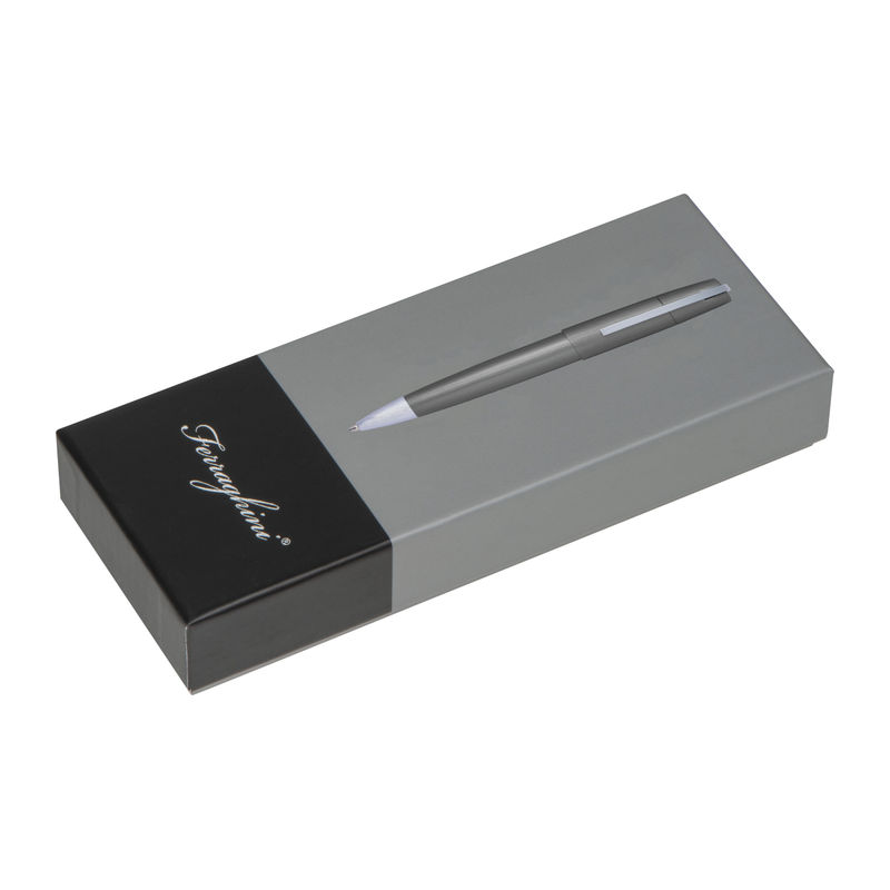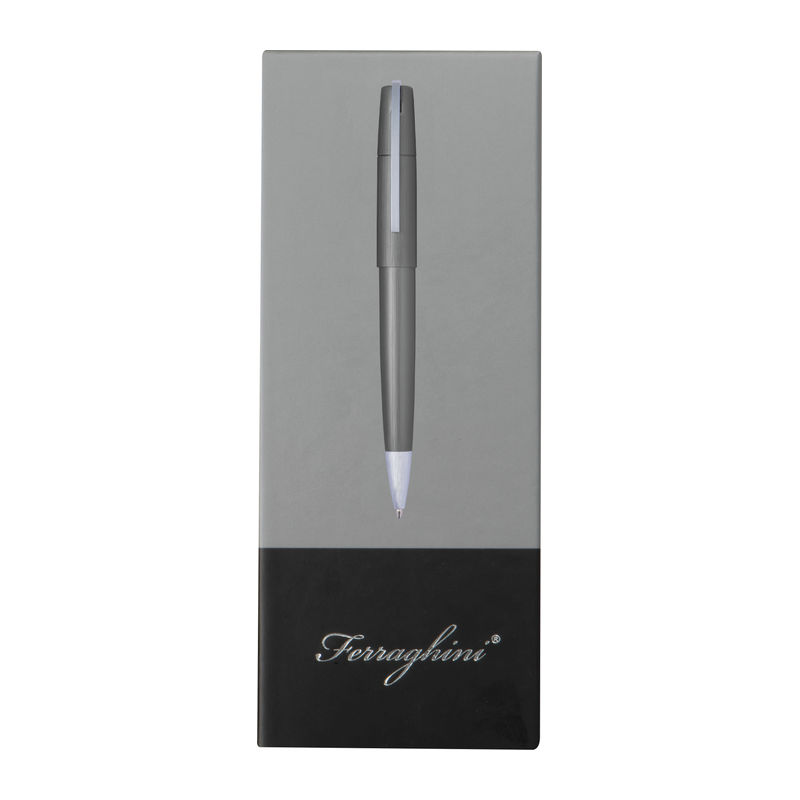 Κομψά στυλό τύπου μπίρος με μηχανισμό περιστροφής από τη Ferraghini, κατασκευασμένα από μέταλλο με ασημένιες λεπτομέρειες και ανταλλακτικό μεγάλης χωρητικότητας με μαύρο μελάνι.