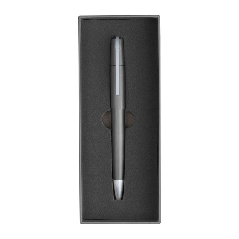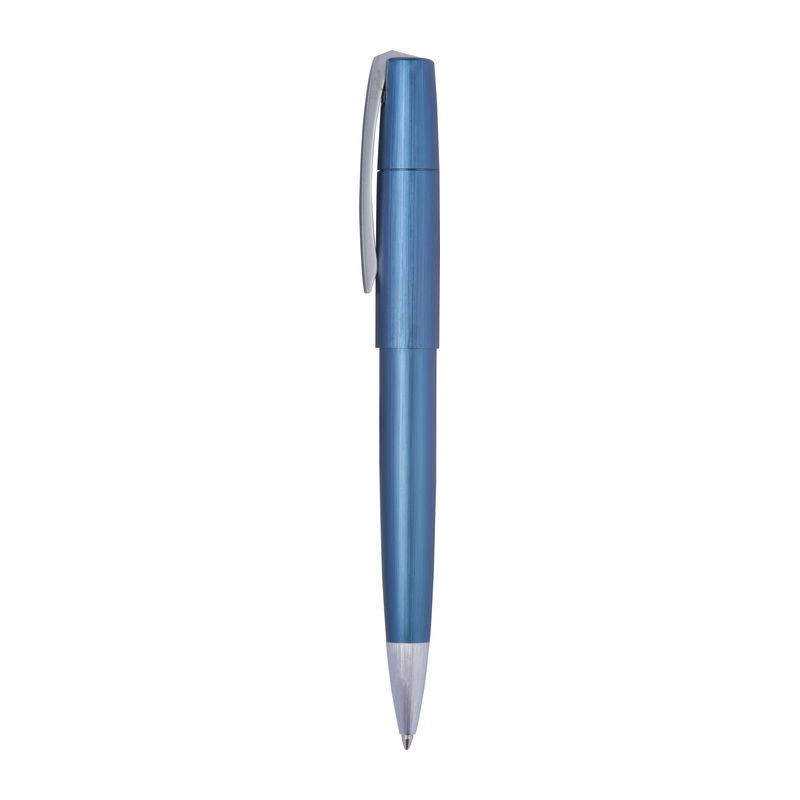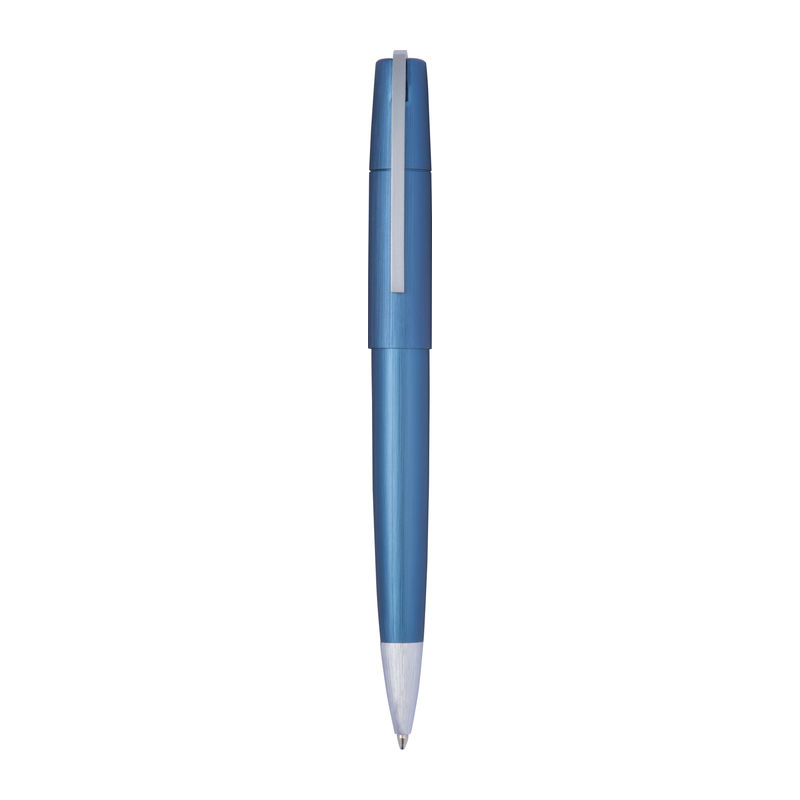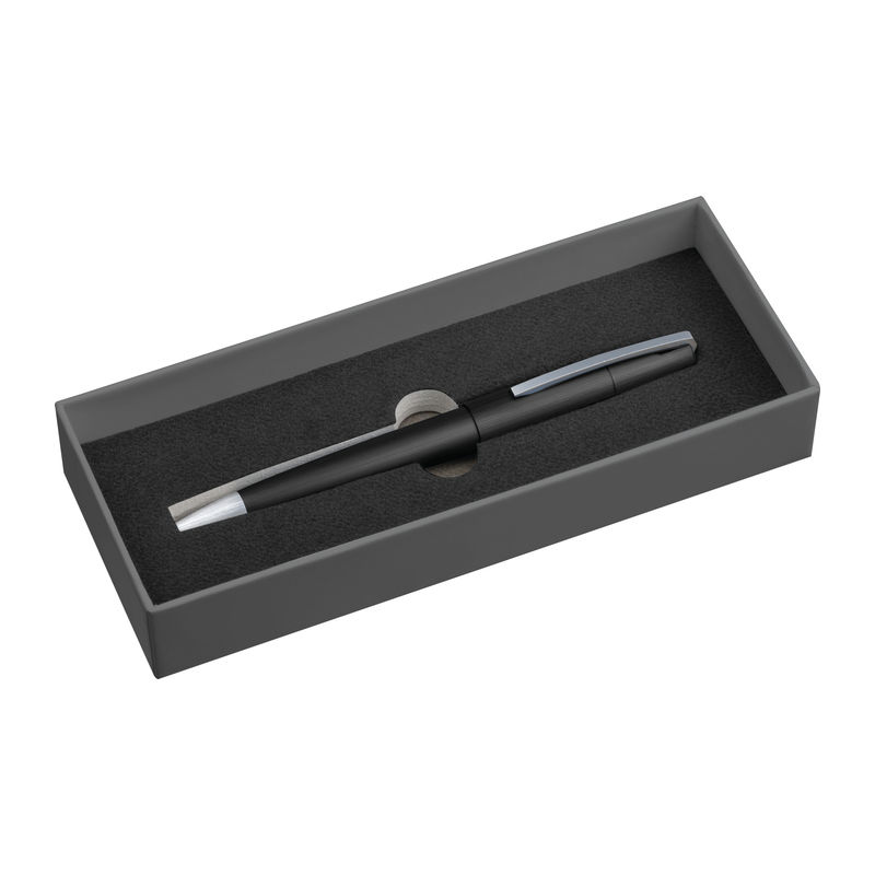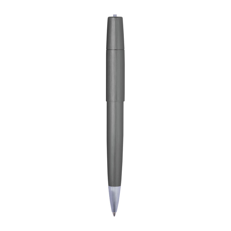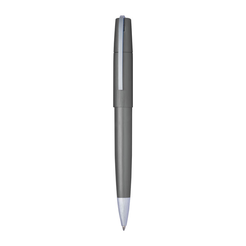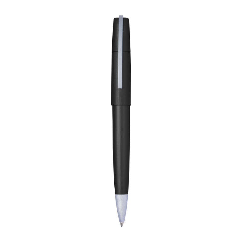 Κομψά στυλό τύπου μπίρος με μηχανισμό περιστροφής από τη Ferraghini, κατασκευασμένα από μέταλλο με ασημένιες λεπτομέρειες και ανταλλακτικό μεγάλης χωρητικότητας με μαύρο μελάνι.