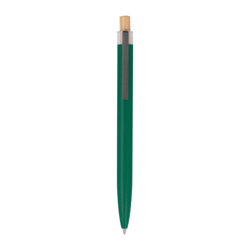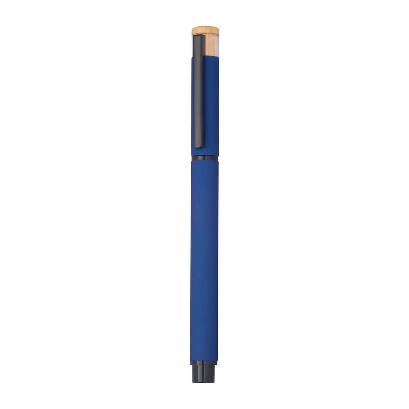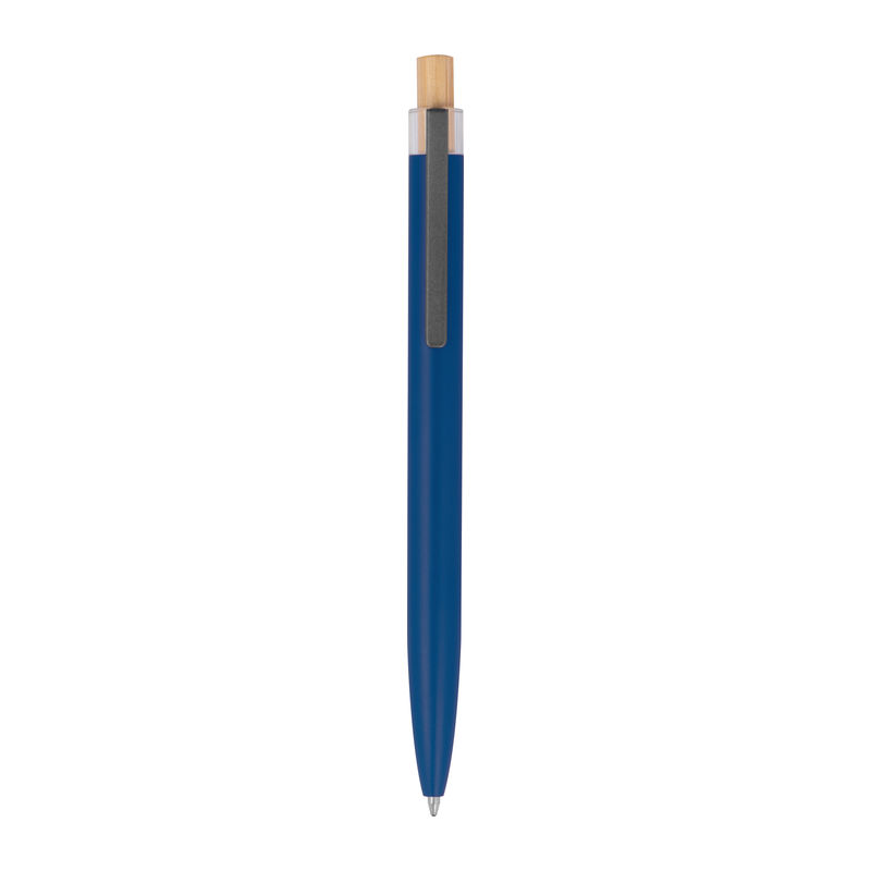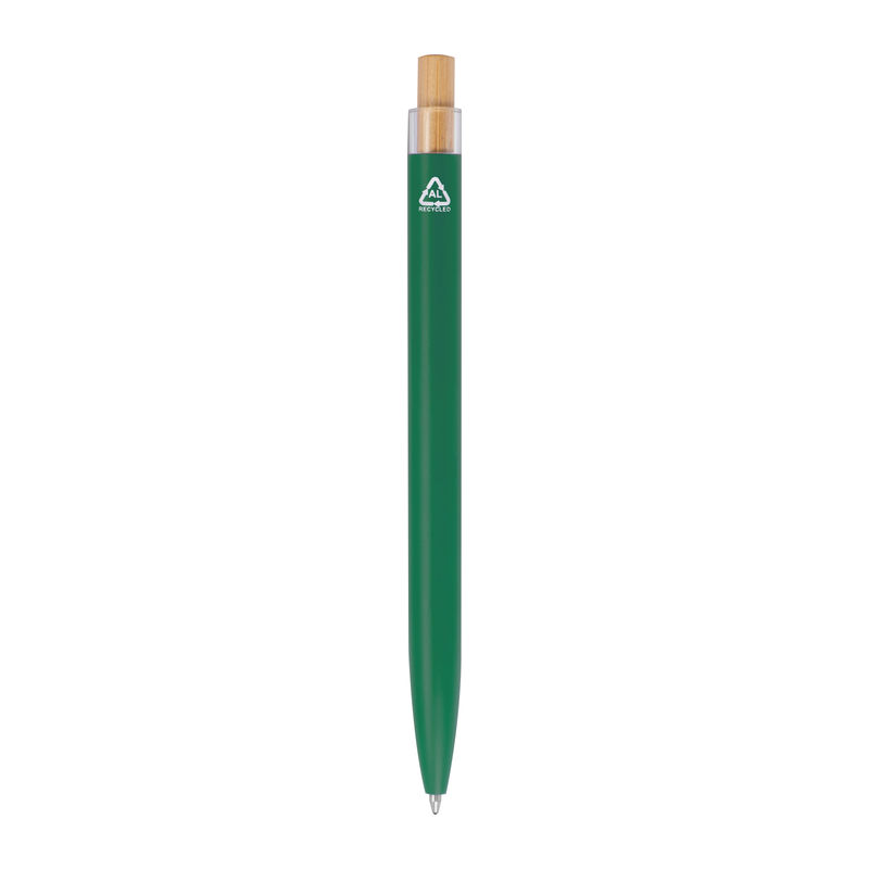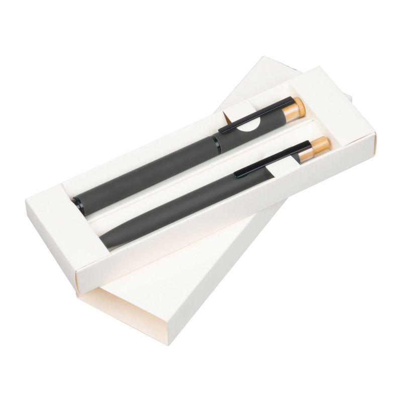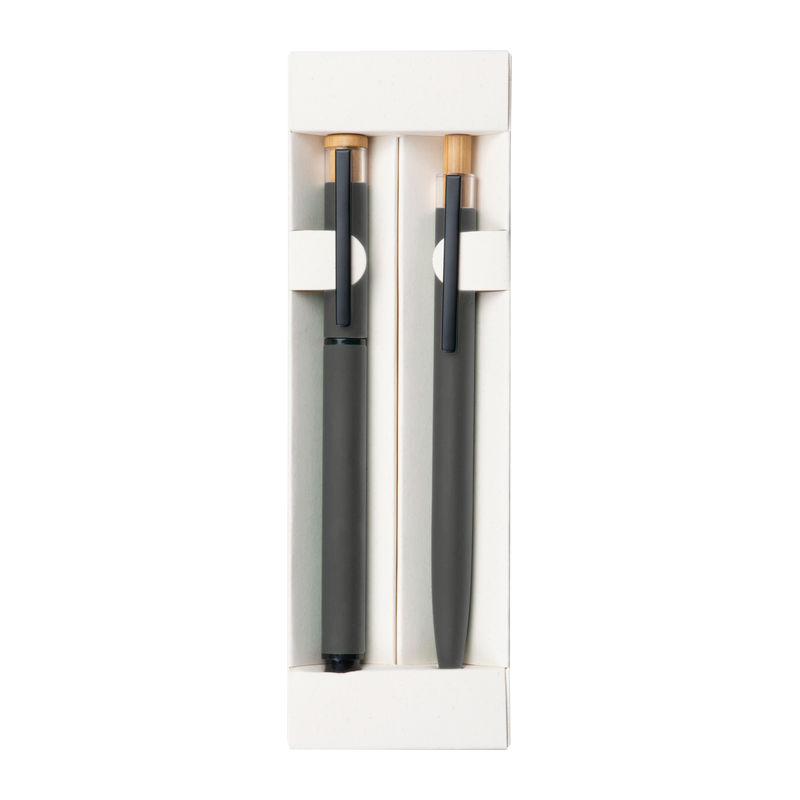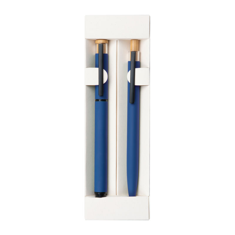 Σετ γραφής που περιλαμβάνει στυλό με μελάνι μπλε ημι-τζελ και rollerball κατασκευασμένα από ανακυκλωμένο αλουμίνιο, με μεταλλικό κλιπ και μπουτόν από μπαμπού, συσκευασμένα σε φιλικό προς το περιβάλλον κουτί.
