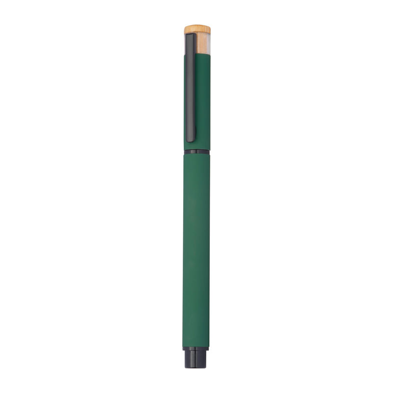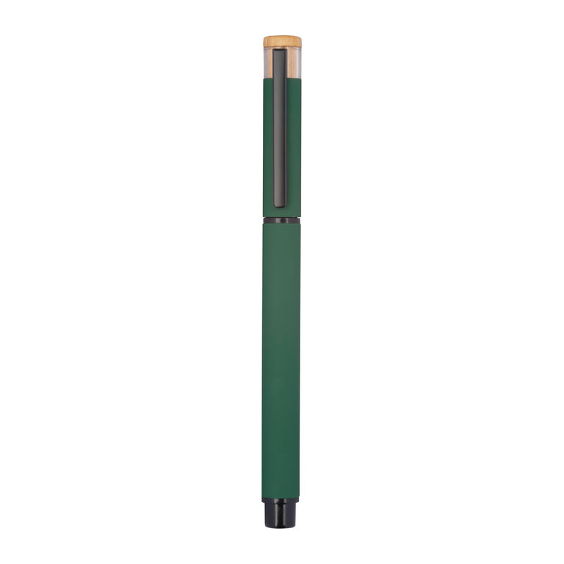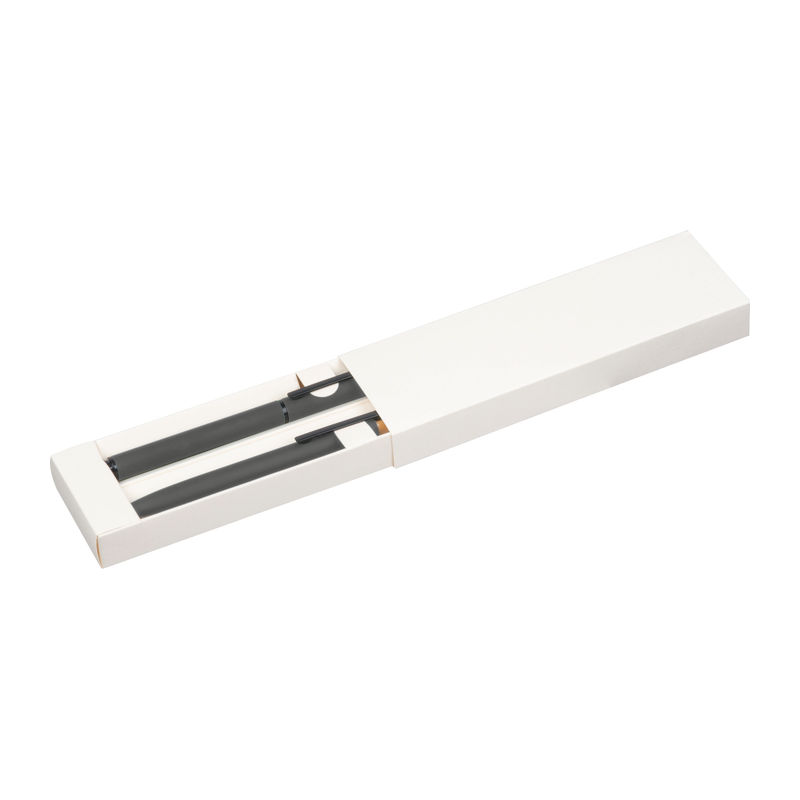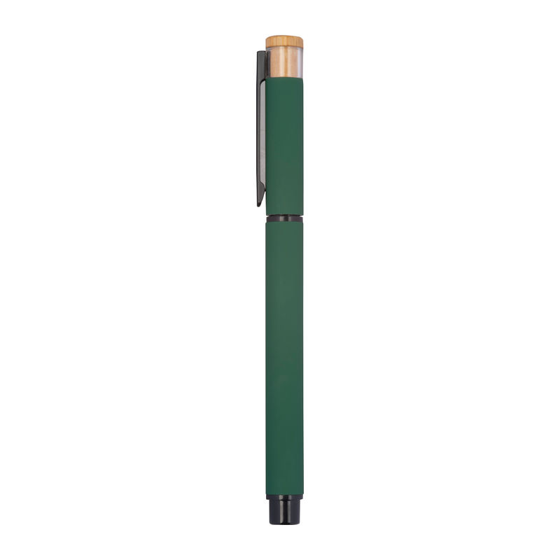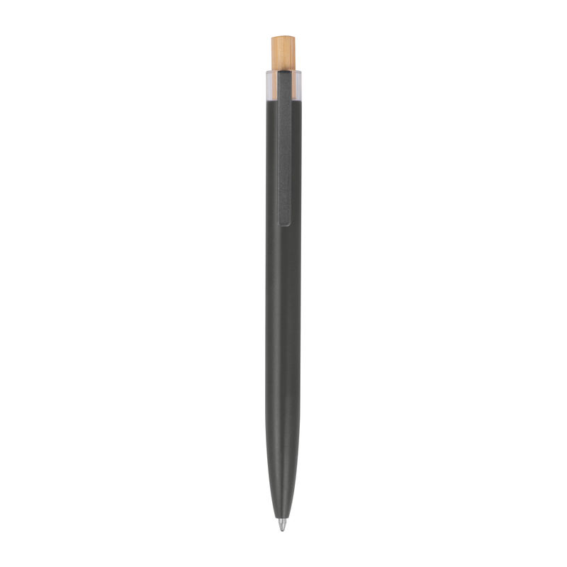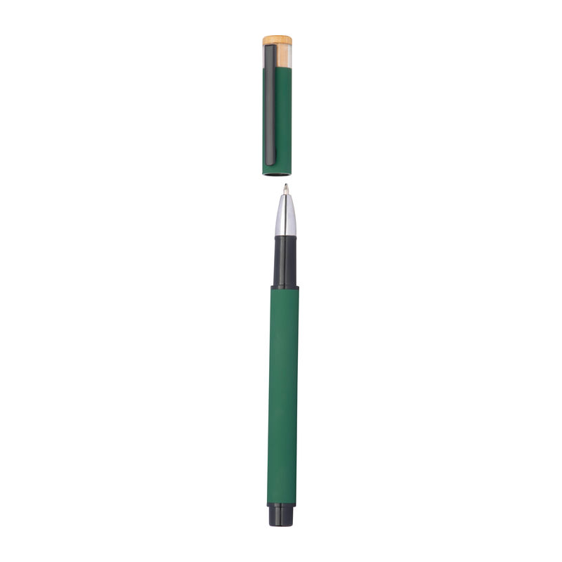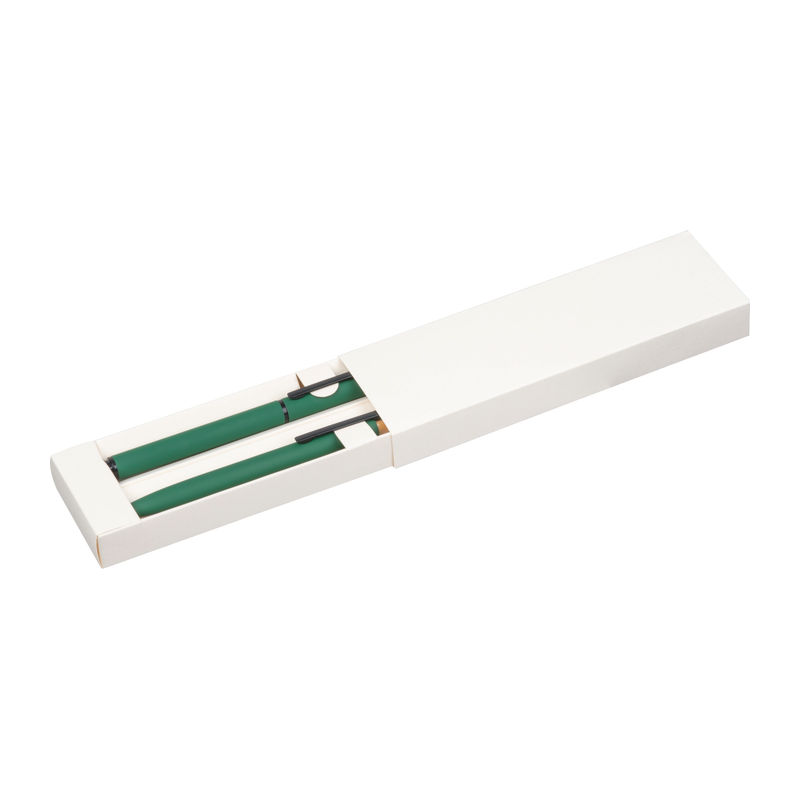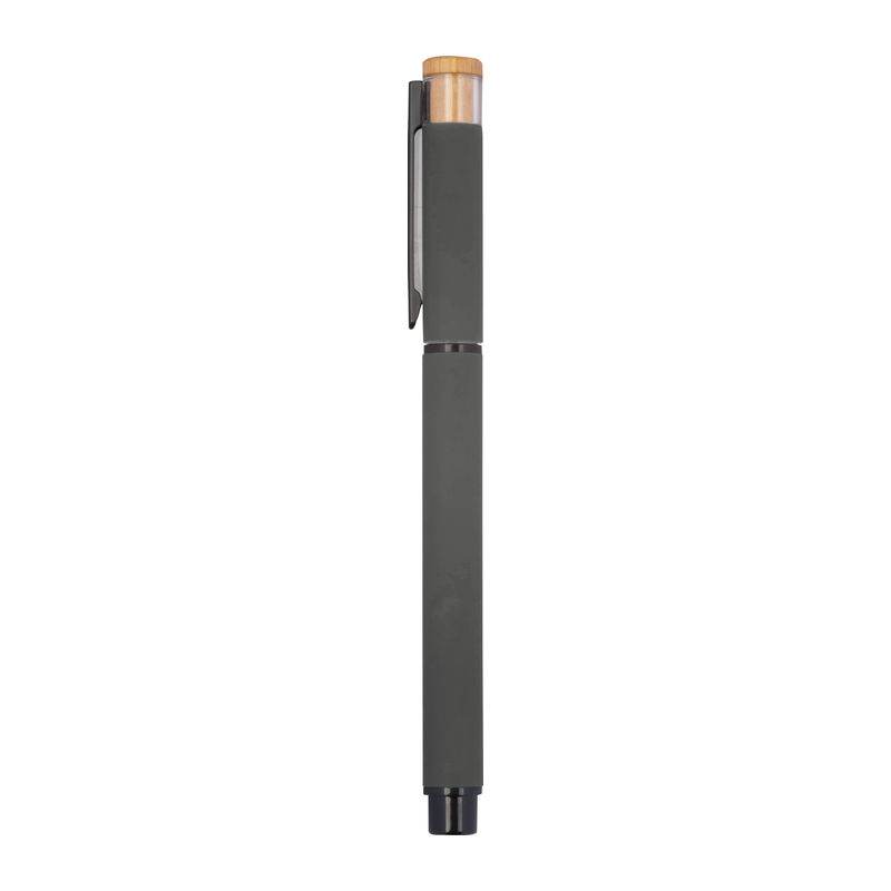 Σετ γραφής που περιλαμβάνει στυλό με μελάνι μπλε ημι-τζελ και rollerball κατασκευασμένα από ανακυκλωμένο αλουμίνιο, με μεταλλικό κλιπ και μπουτόν από μπαμπού, συσκευασμένα σε φιλικό προς το περιβάλλον κουτί.