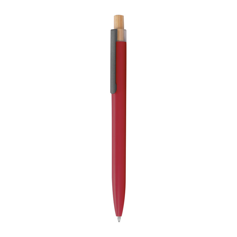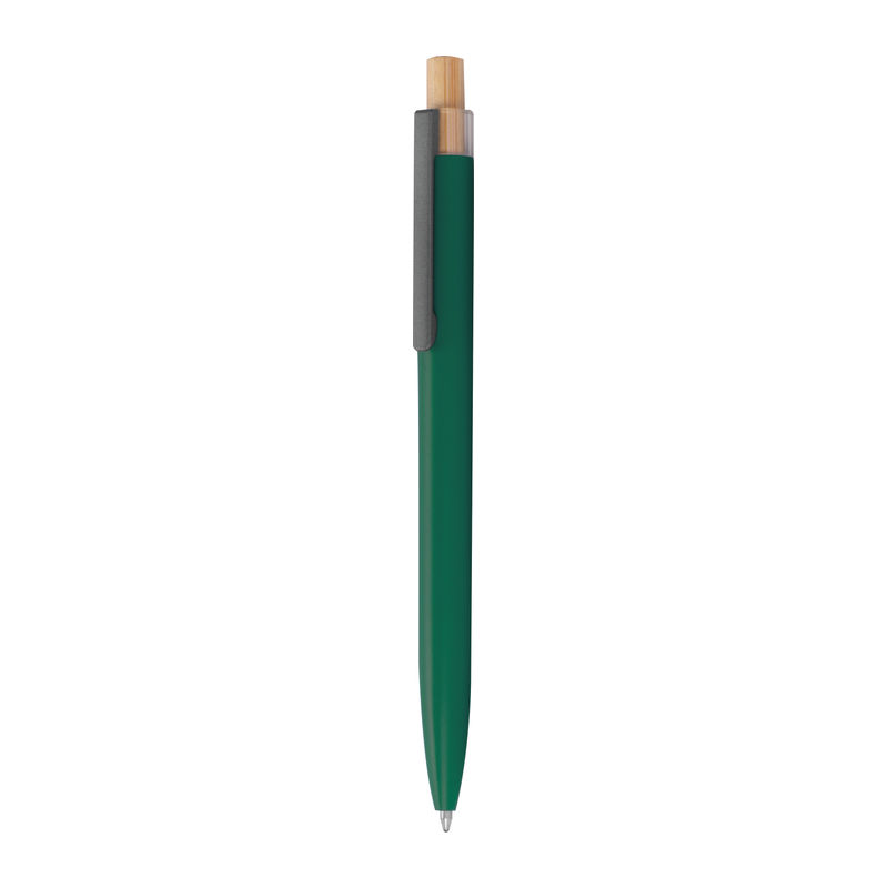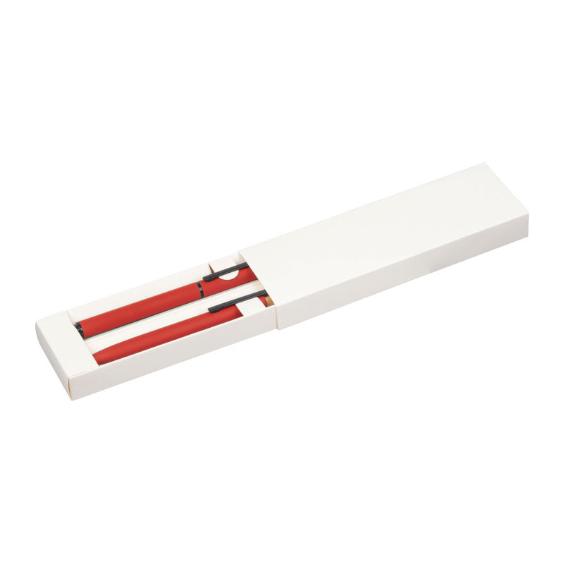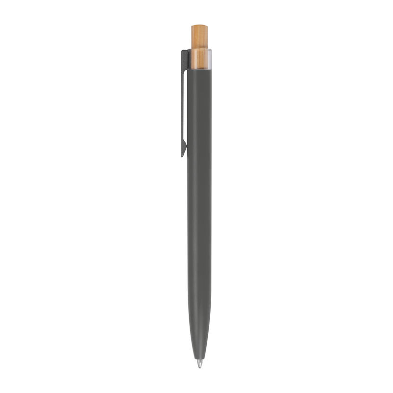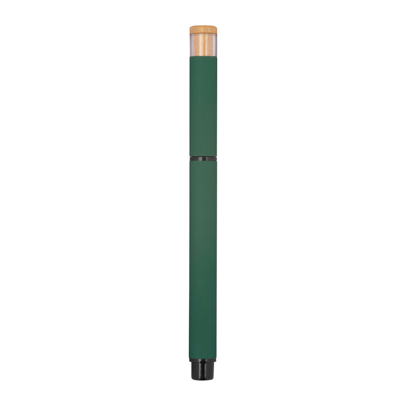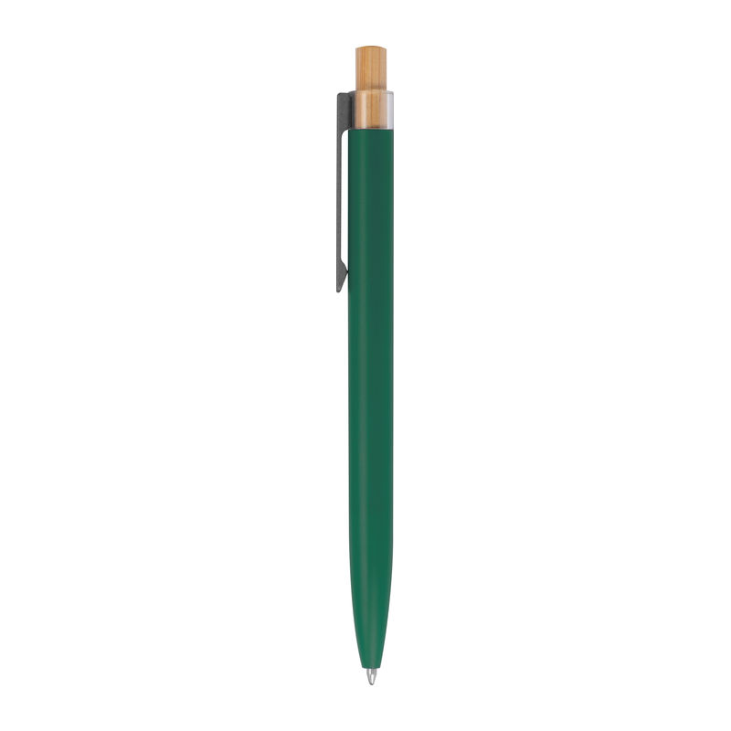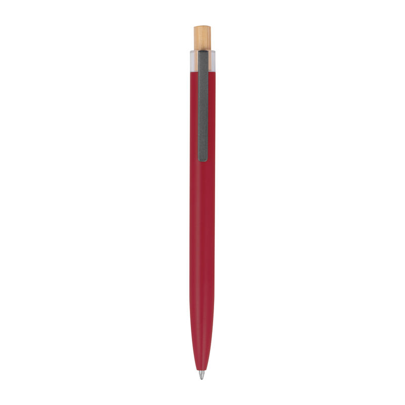 Σετ γραφής που περιλαμβάνει στυλό με μελάνι μπλε ημι-τζελ και rollerball κατασκευασμένα από ανακυκλωμένο αλουμίνιο, με μεταλλικό κλιπ και μπουτόν από μπαμπού, συσκευασμένα σε φιλικό προς το περιβάλλον κουτί.